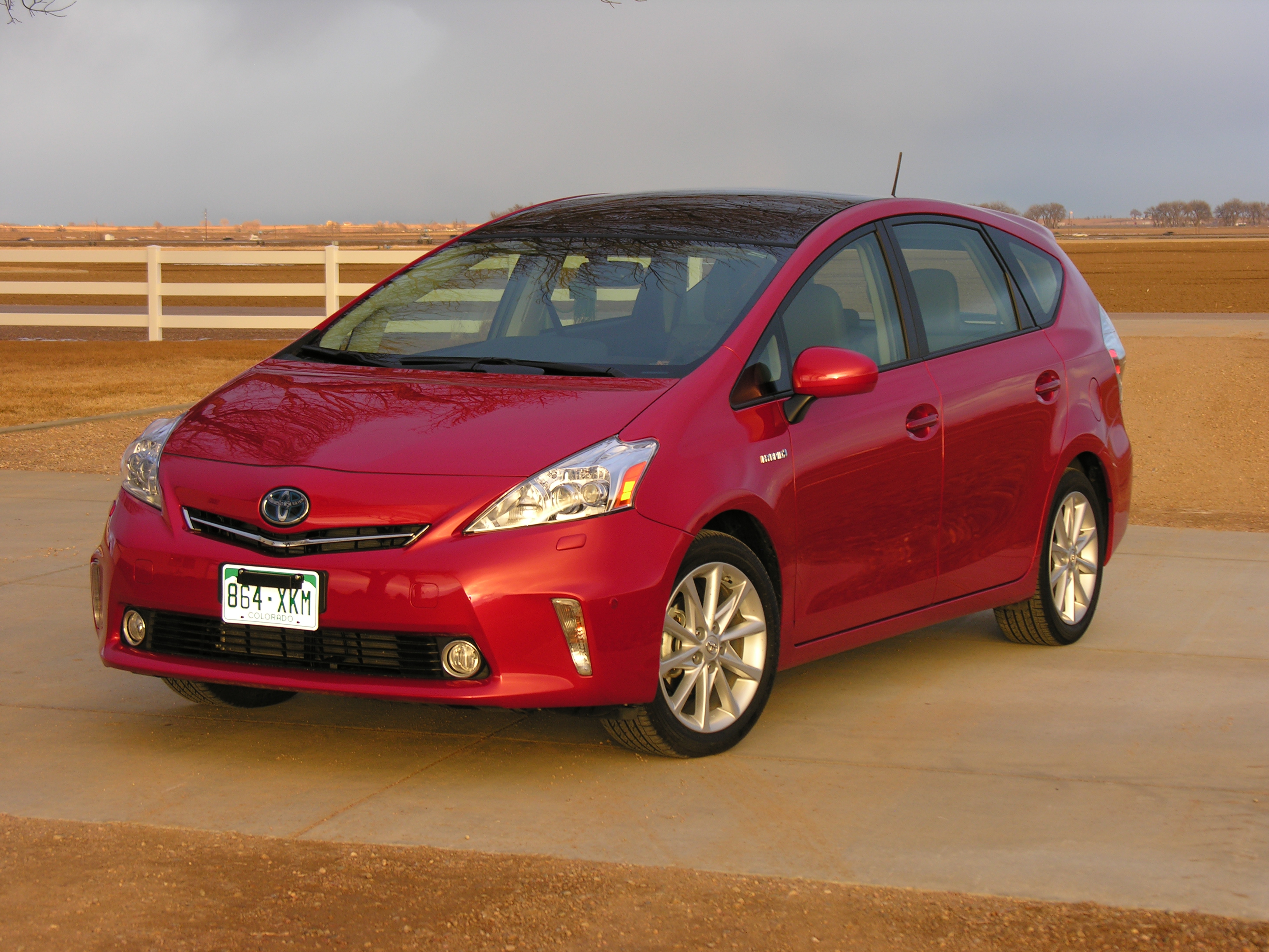 The Barcelona red, front-wheel drive 2012 model Prius V was delivered to my house last week and I immediately planned a trip to Estes Park to buy lunch for my wife, Ruth. I punched the button to begin calculating the fuel mileage for the trip, and we headed for the Other Side (on the other side of Estes). I can’t really complain about the power it provided going up through the canyon, and handling was suitable, as was the ride. In a hybrid like this, the car has a gas (98 hp) engine and two electric (80 & 36 hp) motor/generators that combine (through a planetary gearbox) to power the wheels. Electric motors are actually generators, and visa versa. Put the juice to a motor, and you get motion. Crank the generator, and you get electricity. So these motor/generators in a Prius serve the dual purposes of wheel power and battery charge. And gasoline is the “motion lotion” that makes the car go – no gas, no go. When you leave a stoplight with a Prius, electric power gets you rolling and gasoline power takes it from 15 mph. When you slow down for a light, the weight of the car turns a motor/generator and charges the nickel-metal hydride battery. You can select “EV mode” on the console and creep around with electric power only, for instance in a parking garage at night. You can push a “power” button, too, and get maximum acceleration with max gas power. You cannot plug in a Prius, but I understand a plug-in model is being introduced. It will allow you to go, say, 50 miles without starting the gasoline engine, and the car is to be more expensive.