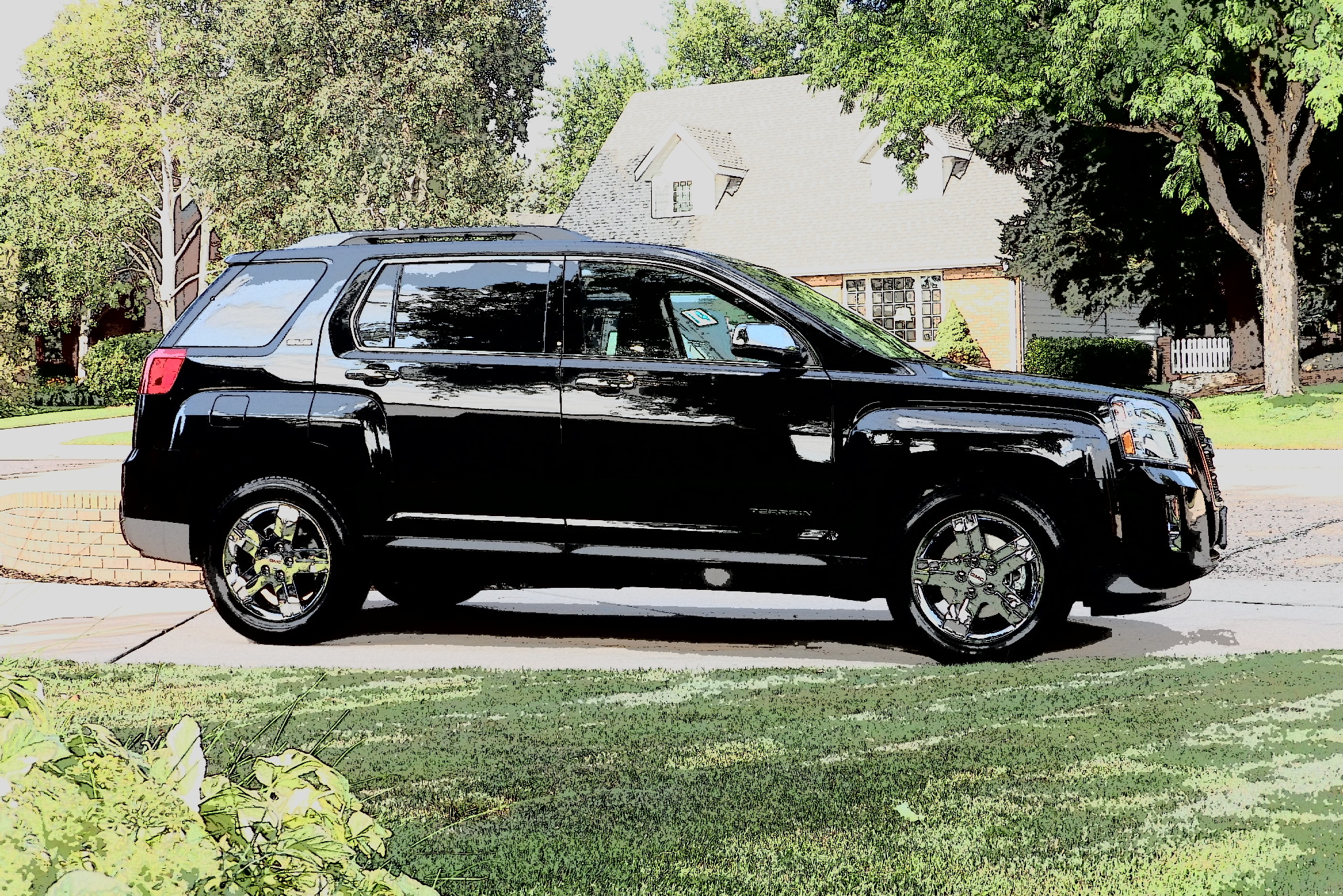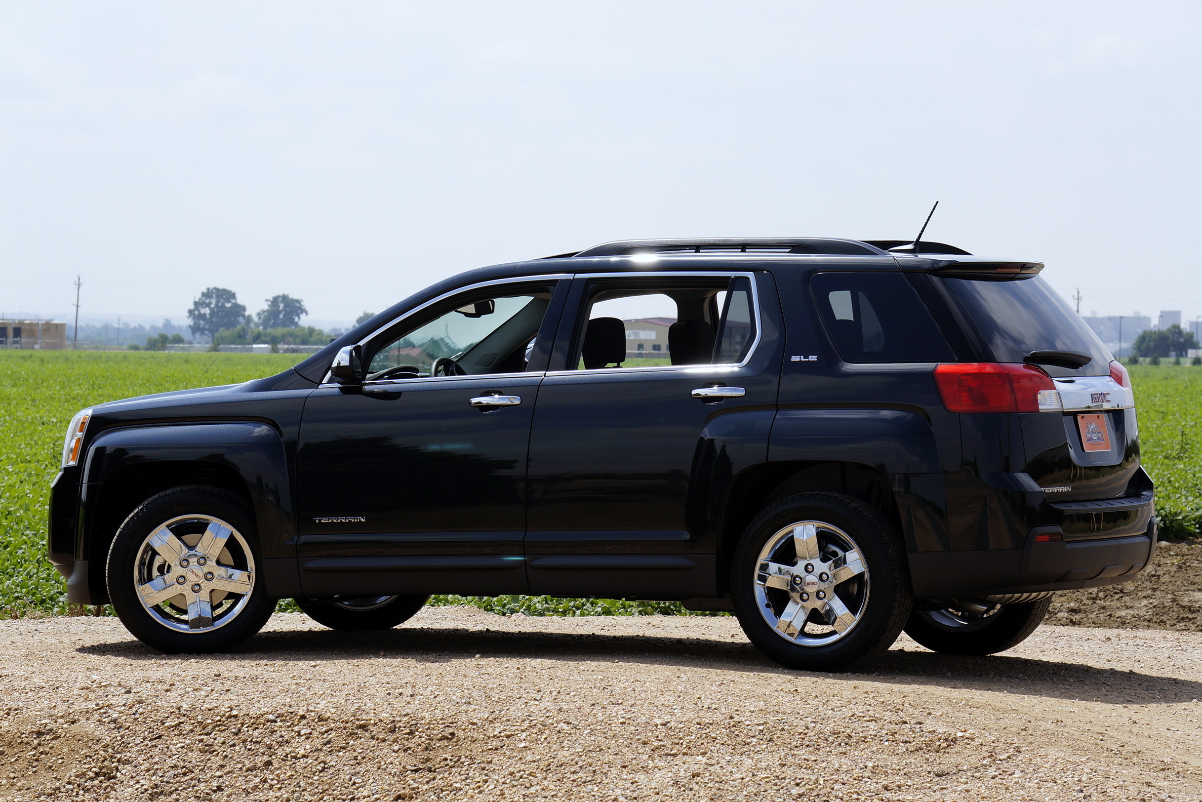 The Terrain that Ruth and I made the trip in was the SLE-2, with upgraded cloth upholstery in black and beautiful extra-cost ($495) Carbon Black metallic paint. M.S.R.P. came to $30,890, including freight ($895), power sunroof ($900), and chrome alloy wheels/door handles/mirrors ($795). The tires mounted on those chrome, five-spoke wheels were Michelin Latitude P235/55R18 all-season radials.