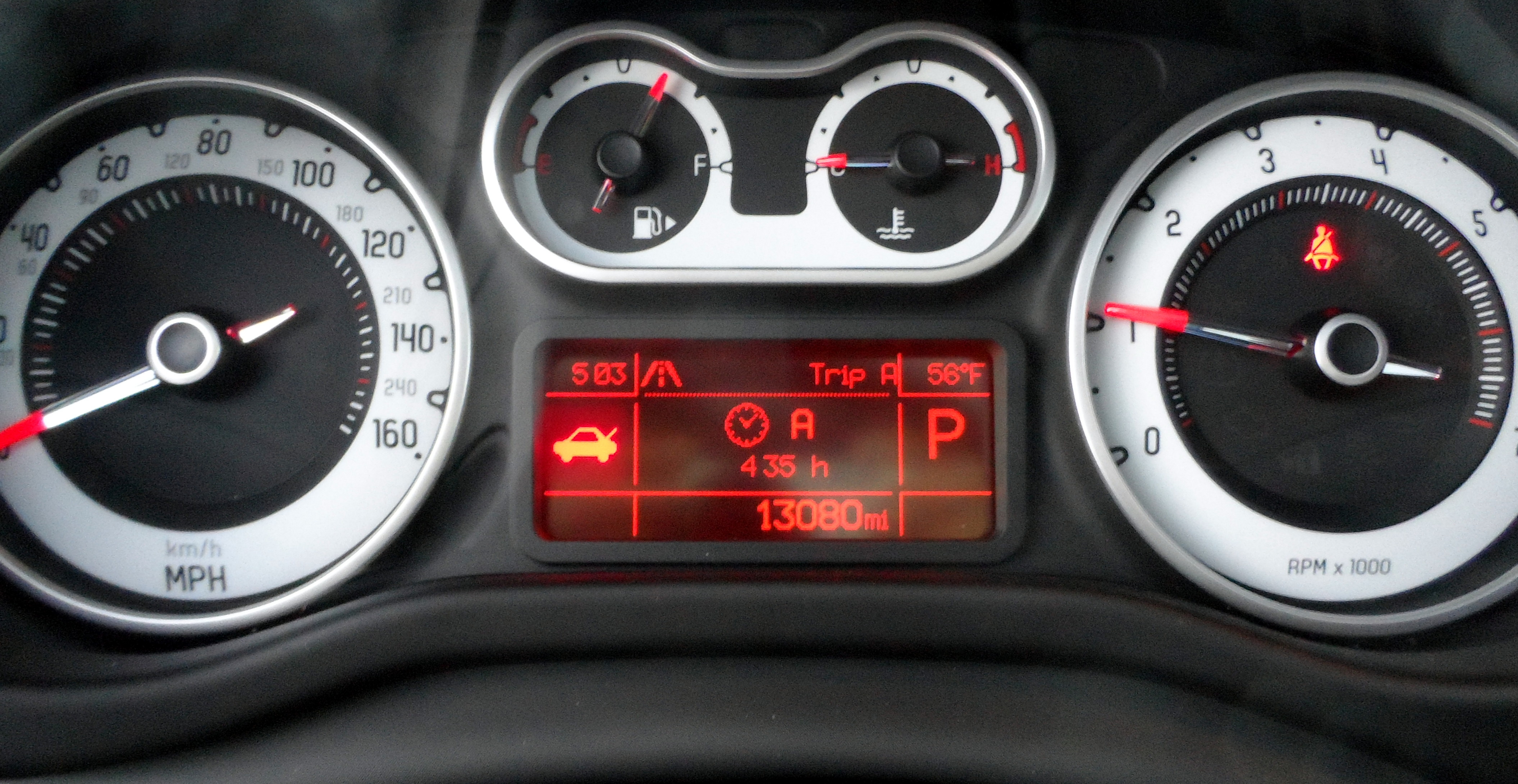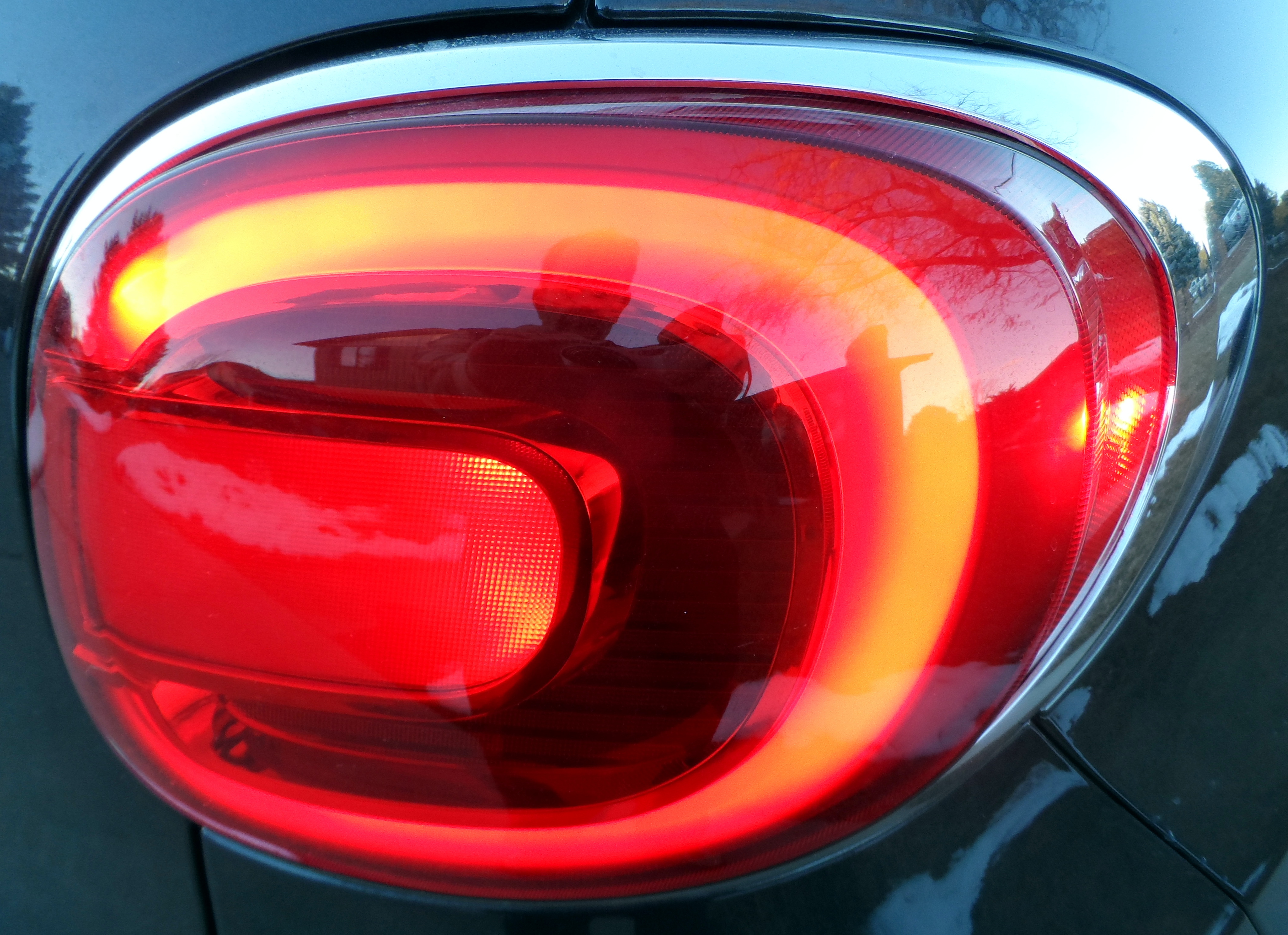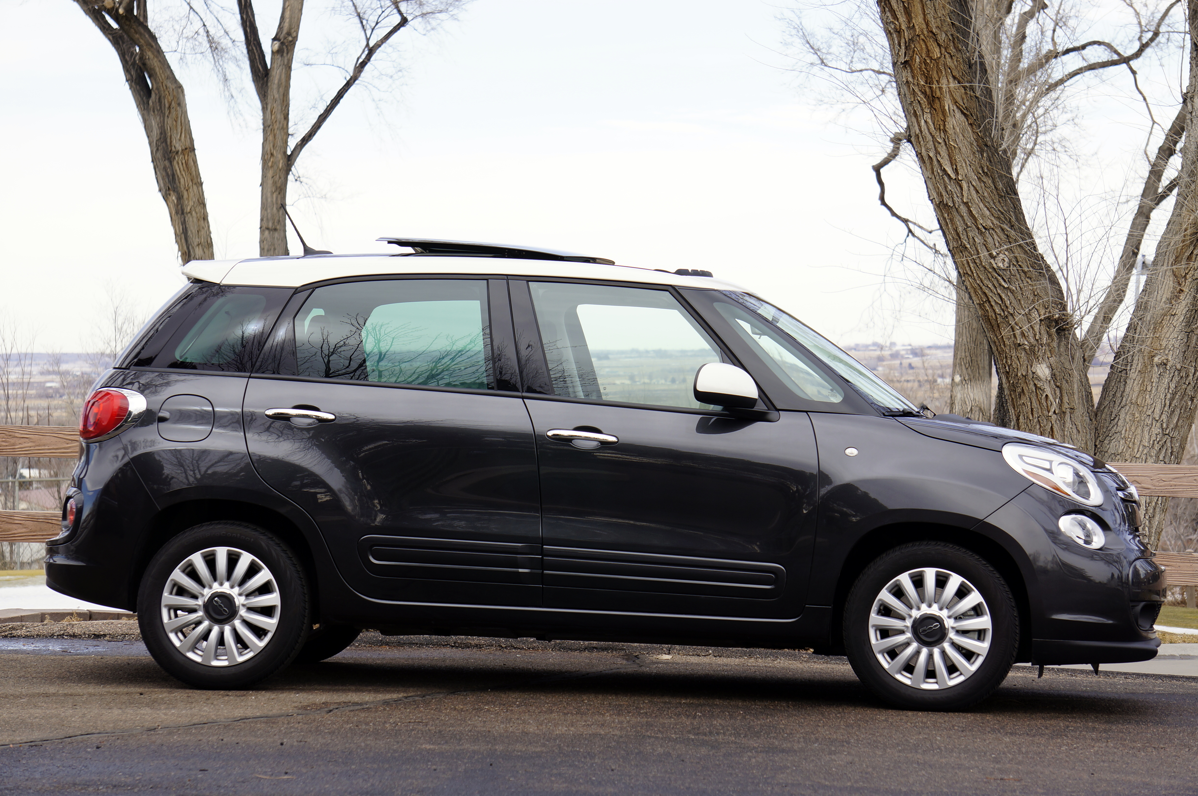 I drove the Fiat to Denver today, and enjoyed the view from the driver’s seat. The car has three windshields, essentially, and up top is a mammoth double power moon roof with shade. The glass opening is nearly as big as the roof, and the front half powers open. I liked the Beats 6-speaker stereo/XM radio, the heated black cloth seats, the dual glove boxes, the crisp 6.5″ navigation/backup camera screen, and the console-mounted emergency brake. I didn’t particularly care for the switch-blade key ignition, the inverted tach/speedometer with uninspiring information display between them, or the somewhat non-supportive buckets up front. The tilt/telescope column, floor shift, 23.1 cubic feet of trunk space, and folding back seat were all on target. INTERIOR GRADE – 85.