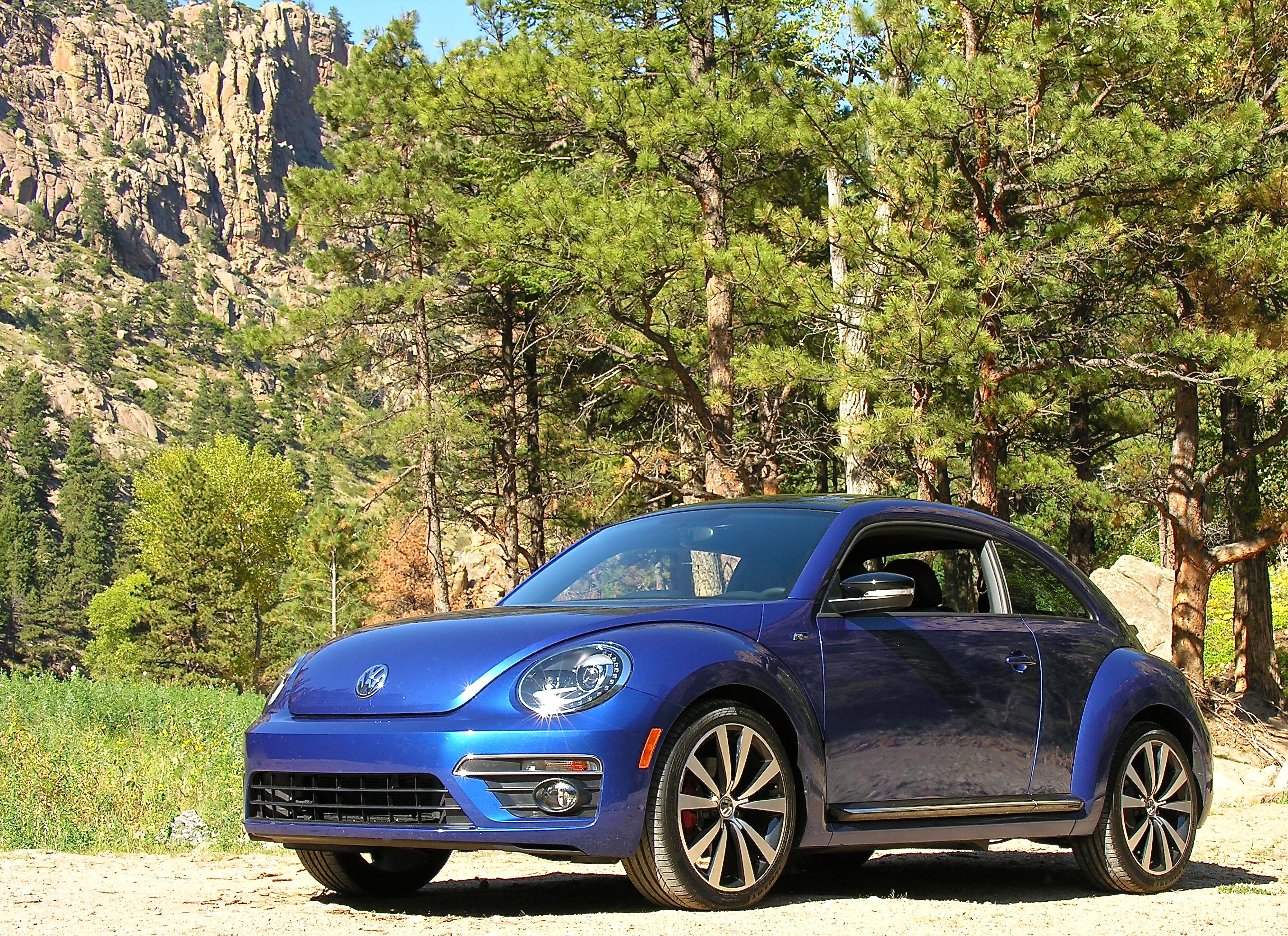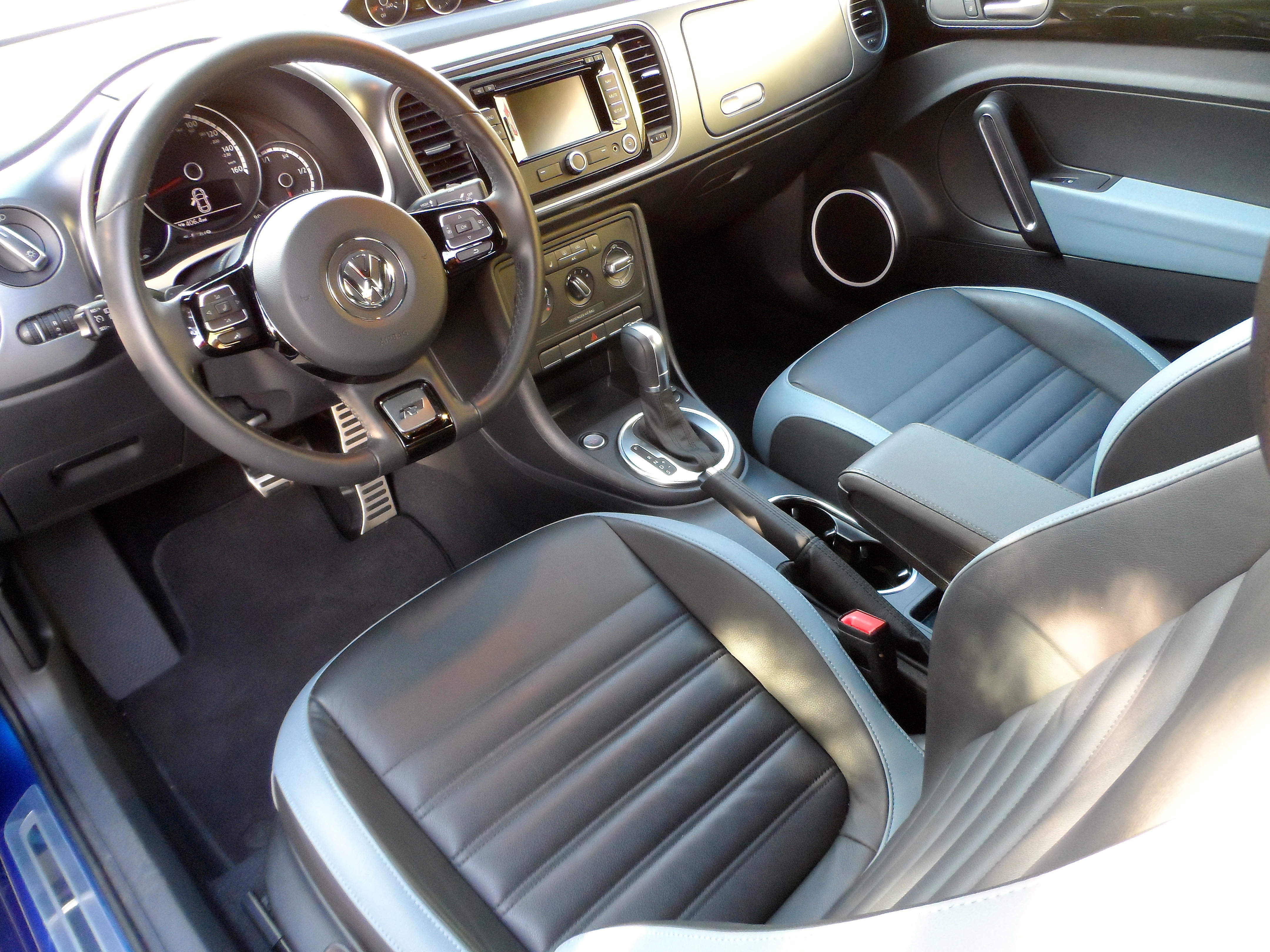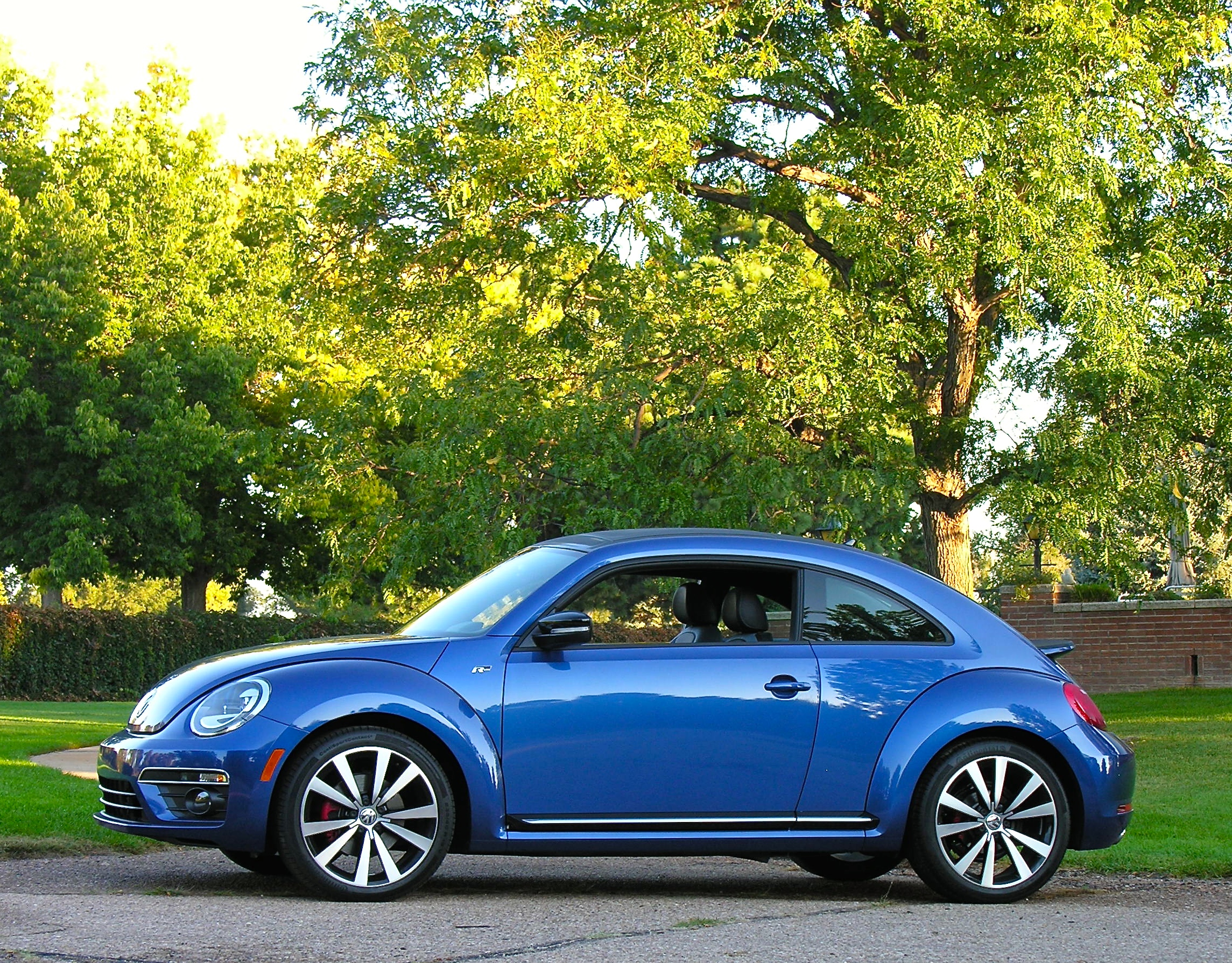 What is commonly called a “New Beetle” with coolant, a front engine, and front-wheel drive, has been marketed on and off since 1997.  Such a car is what was brought to me a week ago for testing, a 2014 Turbocharged Reef blue metallic unit with “R-Line” equipment specified, including a spoiler, “twister” alloy wheels, extra gauges, aluminum pedal covers, and special badging.