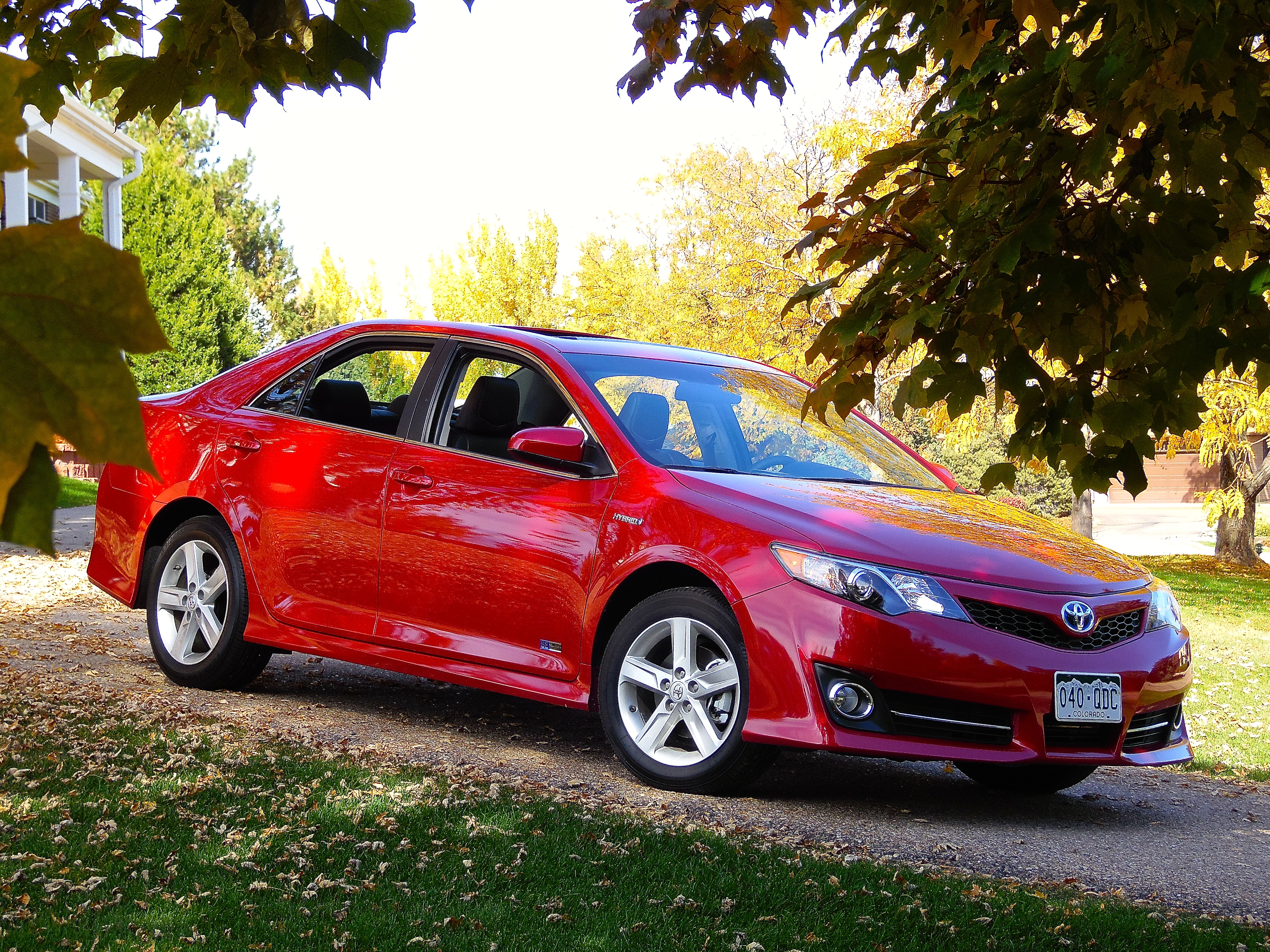 The Toyota Camry Hybrid mid-size FWD sedan was introduced in May of 2006 as a 2007 model. The current unit is in its second generation iteration. A 2014.5 Toyota Camry SE Hybrid was brought to me last week for testing, and it was equipped as such to arrive at an M.S.R.P. of $30,970.00. The base price of $27,945.00 for the SE model had as additions the navigation system ($1,200.00) and power tilt/slide moon roof ($915.00). The car came in “Barcelona Red” paint, which was fun to photograph, and the cloth seating was black. It’s a five passenger sedan with a suitably sized rear passenger compartment and a 13.1 cubic foot trunk. Curb weight was 3,545 lbs., wheelbase was 109.3”, and overall length came in at 189.2”.