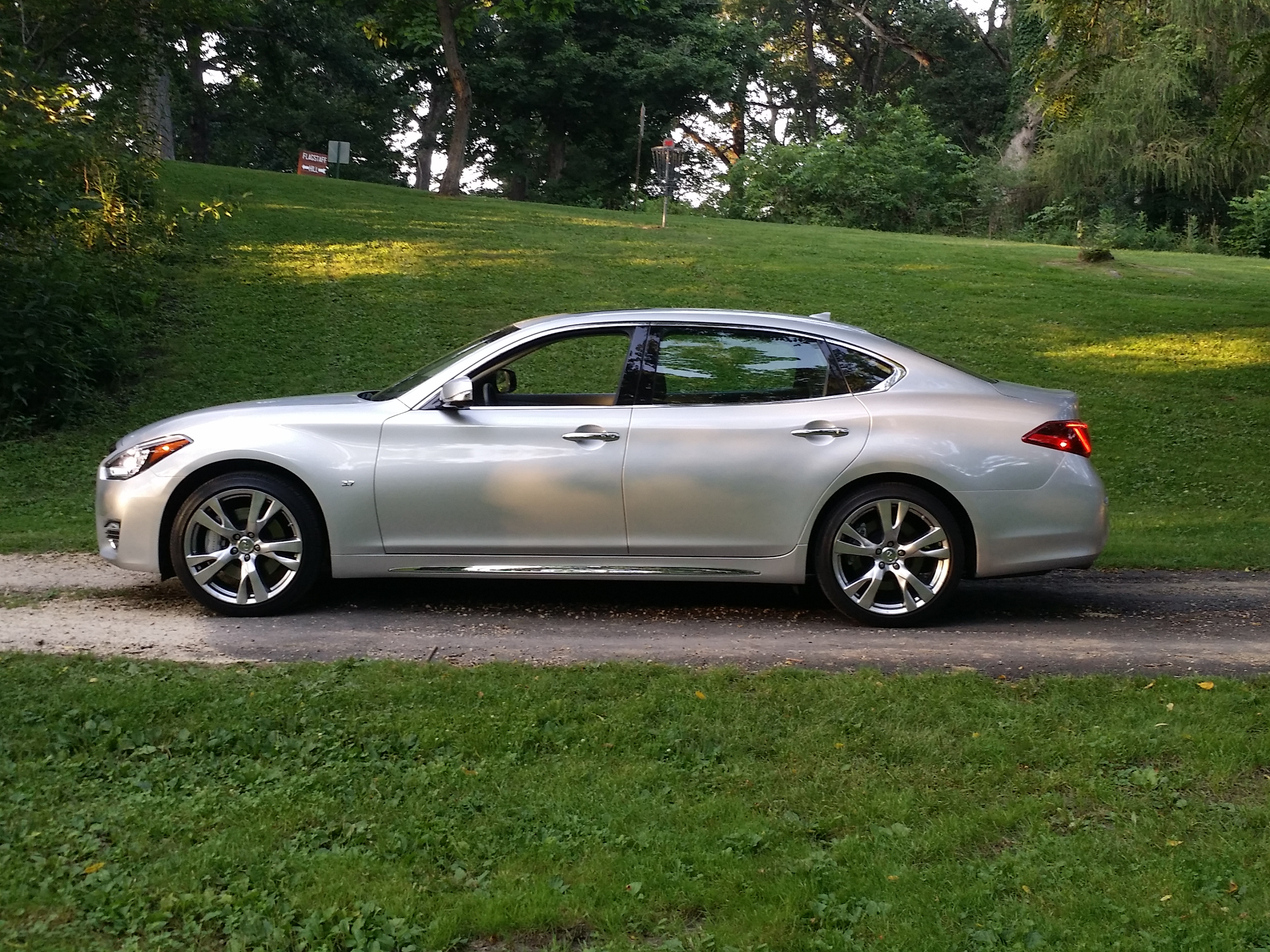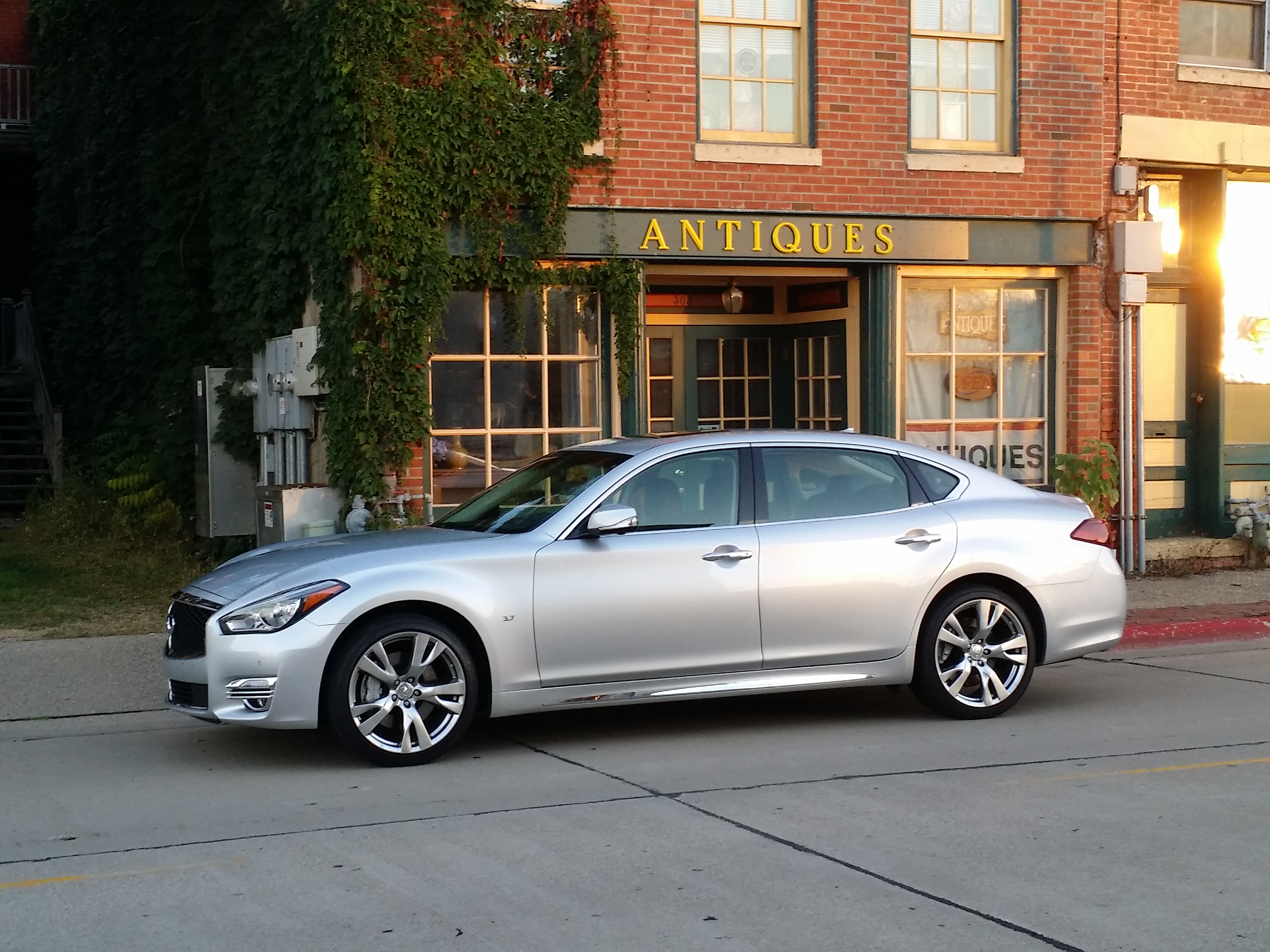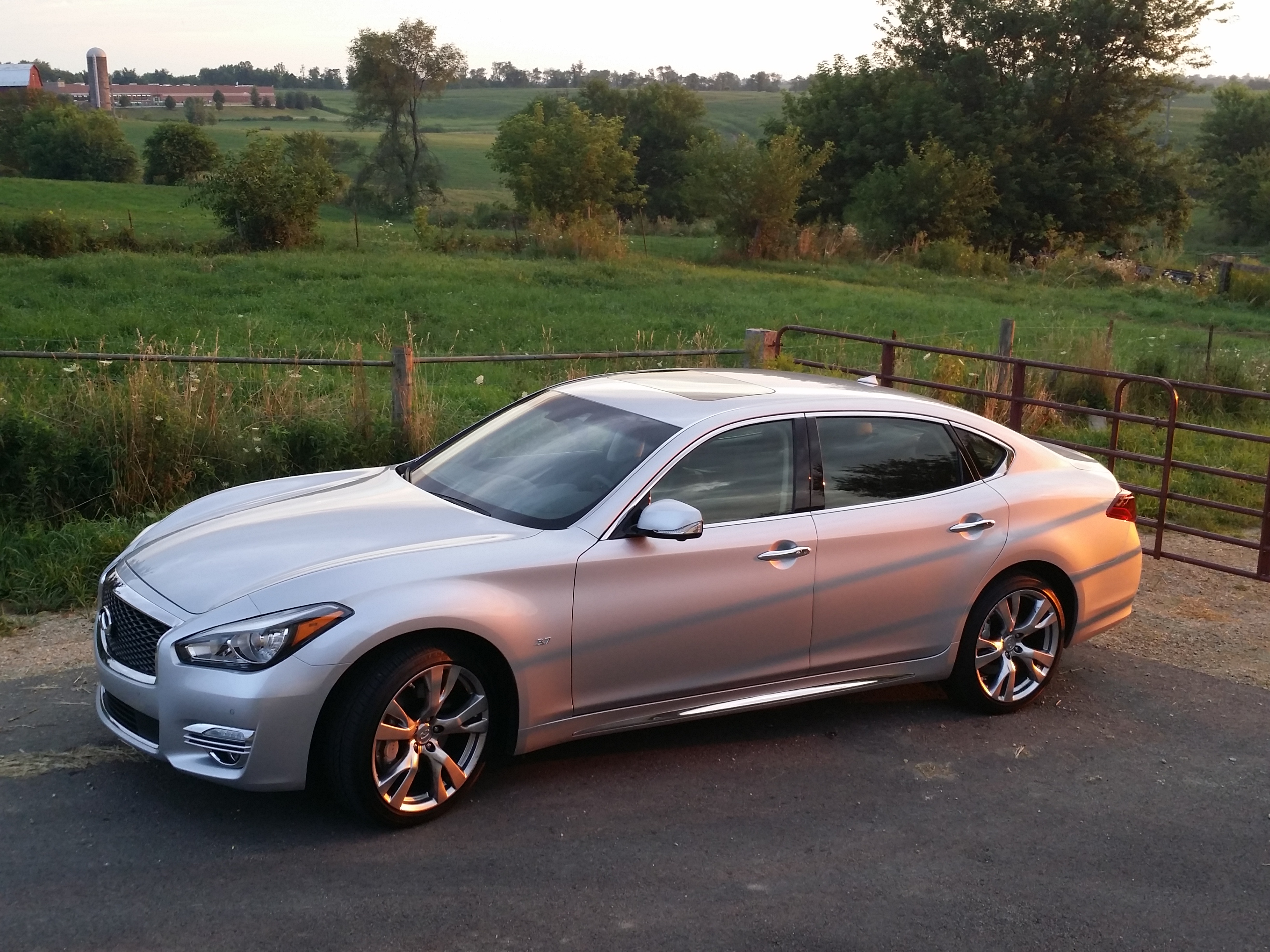 being the 2015 Q70L, a high performance, rear-wheel drive four door sedan with V-6 power. A Liquid Platinum silver Q70L was waiting for Ruth and I at Chicago’s O’Hare International airport recently and I had the pleasure of wringing it out for a few days in western Illinois. Inside it had sumptuous Graphite leather seating and Japanese white ash (real) wood trim accents. It’s a five passenger car with terrific (heated and air conditioned) bucket seats and room for three in the back – heated seating, as well. All the occupants can be comfortable because as an “L” offering, the car has 6″ additional interior space, specifically in the rear passenger compartment. As a loaded car it contains the things you would expect as such; heated/tilting/telescoping steering wheel, ten way power buckets, all-around parking/blind spot monitor, power moon roof, push button ignition, dual zone climate setup, Bose 2-channel, 10 speaker audio, 8” VGA color touch-screen navigation display, radar cruise control, and USB/Ipod connections. M.S.R.P. for the Q70L that I drove was $60,605.00, which included the base car ($51,350.00), deluxe touring package ($3,900.00), technology package ($3,300.00) 20” alloy wheel package ($1,150.00), and freight of $905.00.