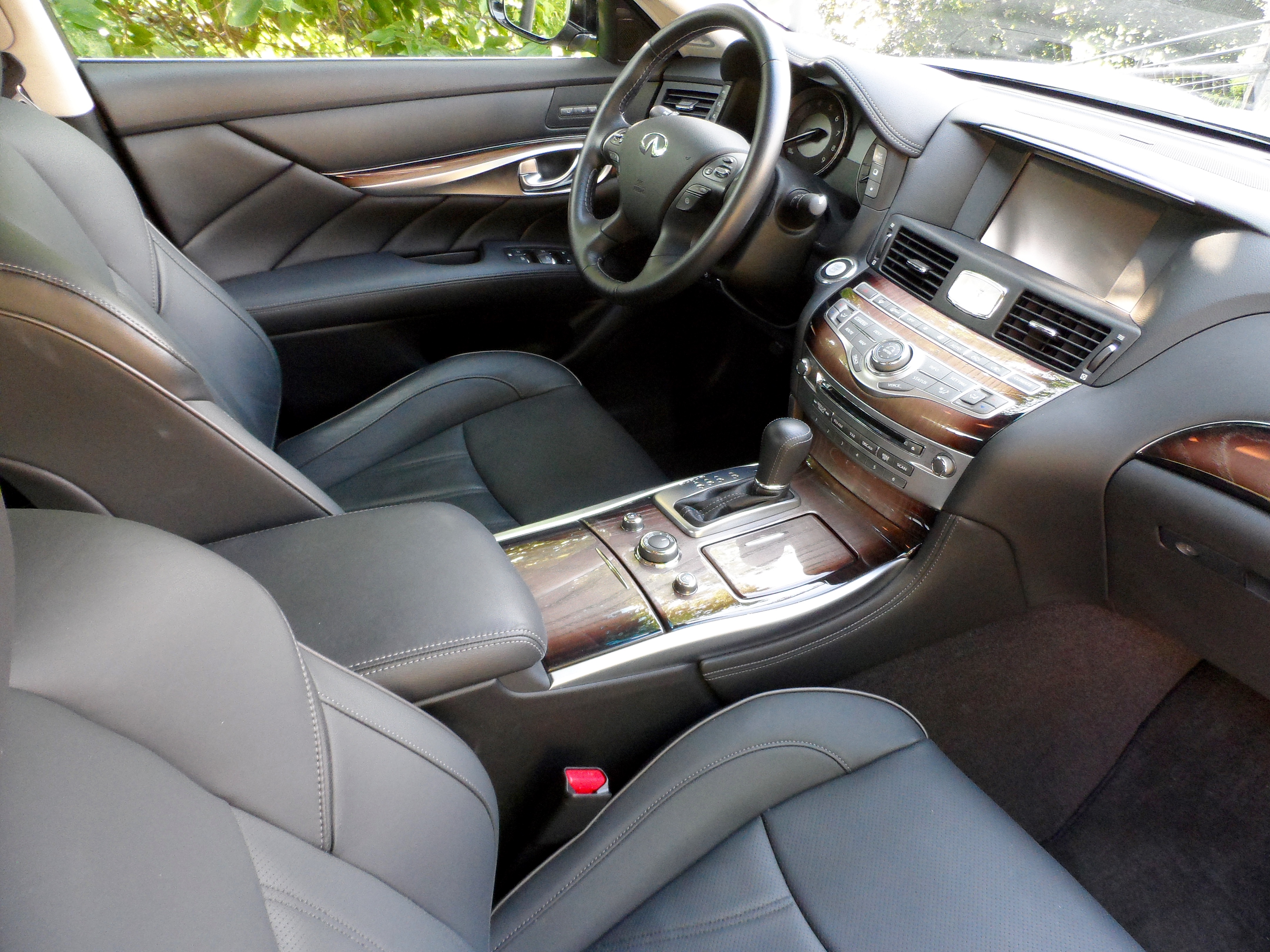 After looking over the Q70L at the airport, my wife and I headed for Galena, Illinois for the weekend. I wanted to take U.S. 20 to check out the 330 horsepower (270 lb.ft. of torque) V-6 and seven speed automatic with manual shift mode. What a ride! This machine has some giddyup and is a treat out on the road. Also, when crossing rails or tar strips the car feels like a block of steel – no shudder, creaking, or shake. Zero to 60 time is six seconds (3,957 lb. car) and the top speed, reportedly, is governor limited at about 135 mph. Fuel mileage estimates are 18/city and 26/highway (20 gallon tank), and I averaged about 21 mpg running around northwestern Illinois. Handling and ride are firm and compliant with real nice steering feel. Bridgestone RE97as Potenza 245/40R20 radials are wrapped around the ten spoke polished alloys and chrome is on hand both at the lower rocker molding area and on the door handles. It’s a good looking car.