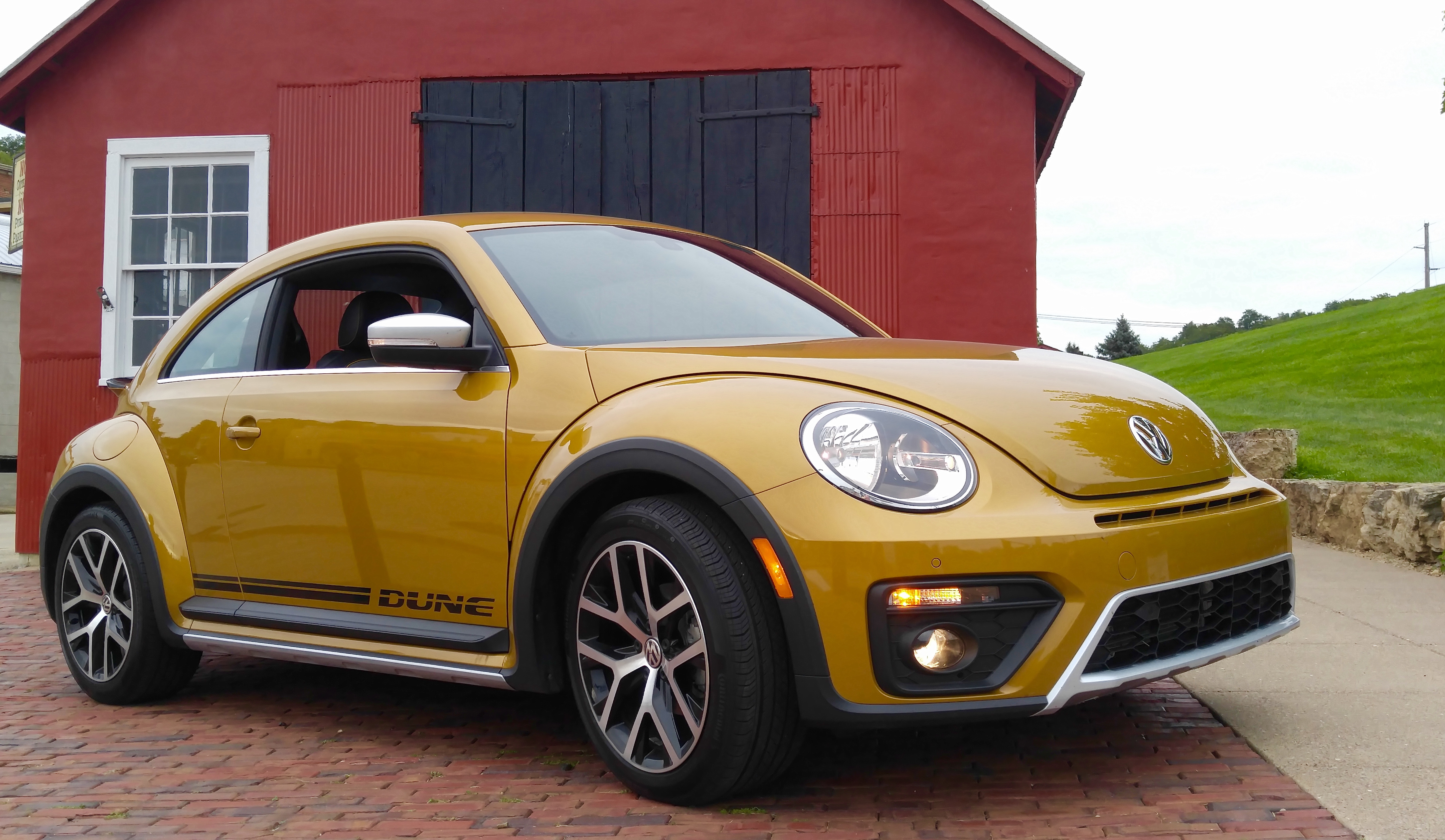 What is commonly called a “New Beetle” with coolant, a front engine, and front-wheel drive, has been marketed on and off since 1997. Such a car is what I picked up at General Mitchell Airfield in Milwaukee to drive on a midwest vacation. It was a 2016 Turbocharged Sandstorm Yellow metallic unit with “Dune” equipment specified, including a rear spoiler, raised suspension, ten-spoke polished alloy wheels, exclusive bumpers and air intakes, black exterior cladding, aluminum pedal covers, and special badging and decals.