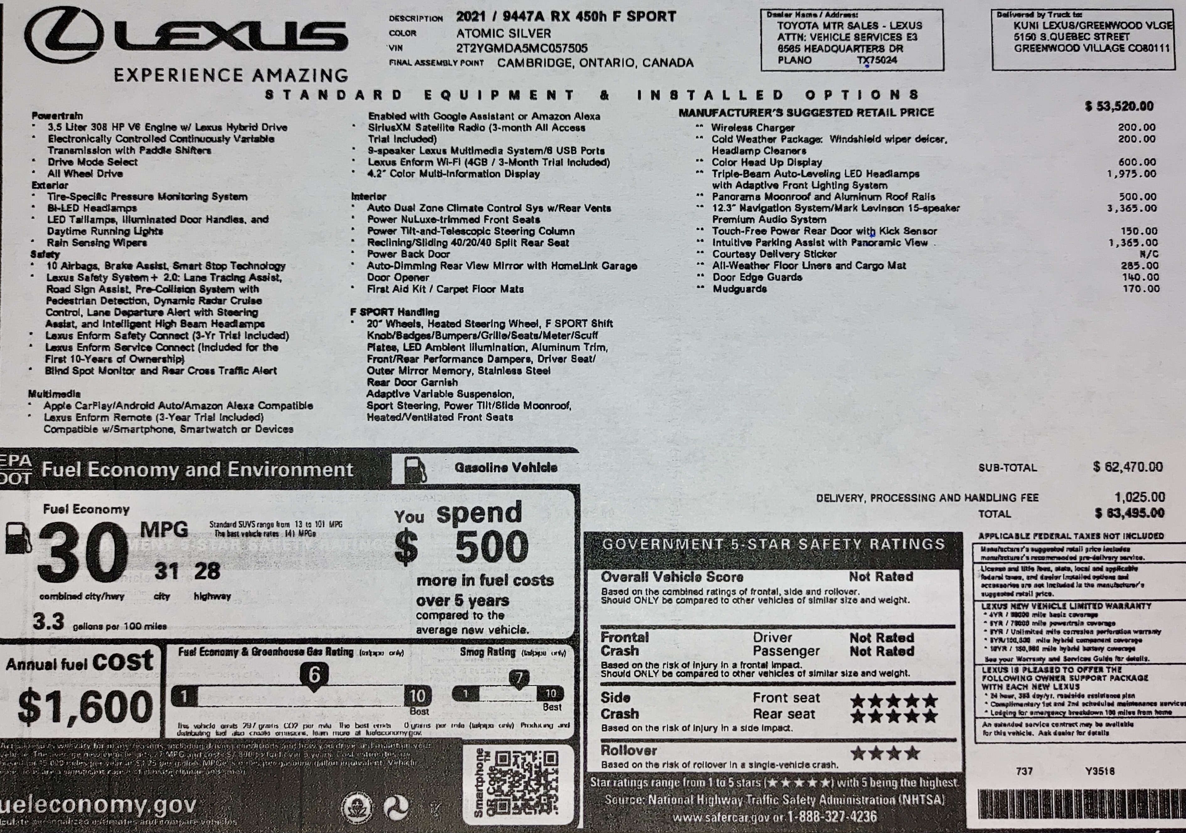 hwy./31-city/30-combined, range is 482 miles with 17.2 gallon tank, floor mounted gear shift, CVT automatic transmission with paddle shifters, lane change alert, blind spot monitor and cross traffic alert, 20” gray finish wheels five spoke wheels with 235/55R20 Yokohama Avid GT all season radial tires, 308 horsepower 6 cylinder 3.5 liter engine, $63,495.00 M.S.R.P. – built in Cambridge, Ontario, Canada