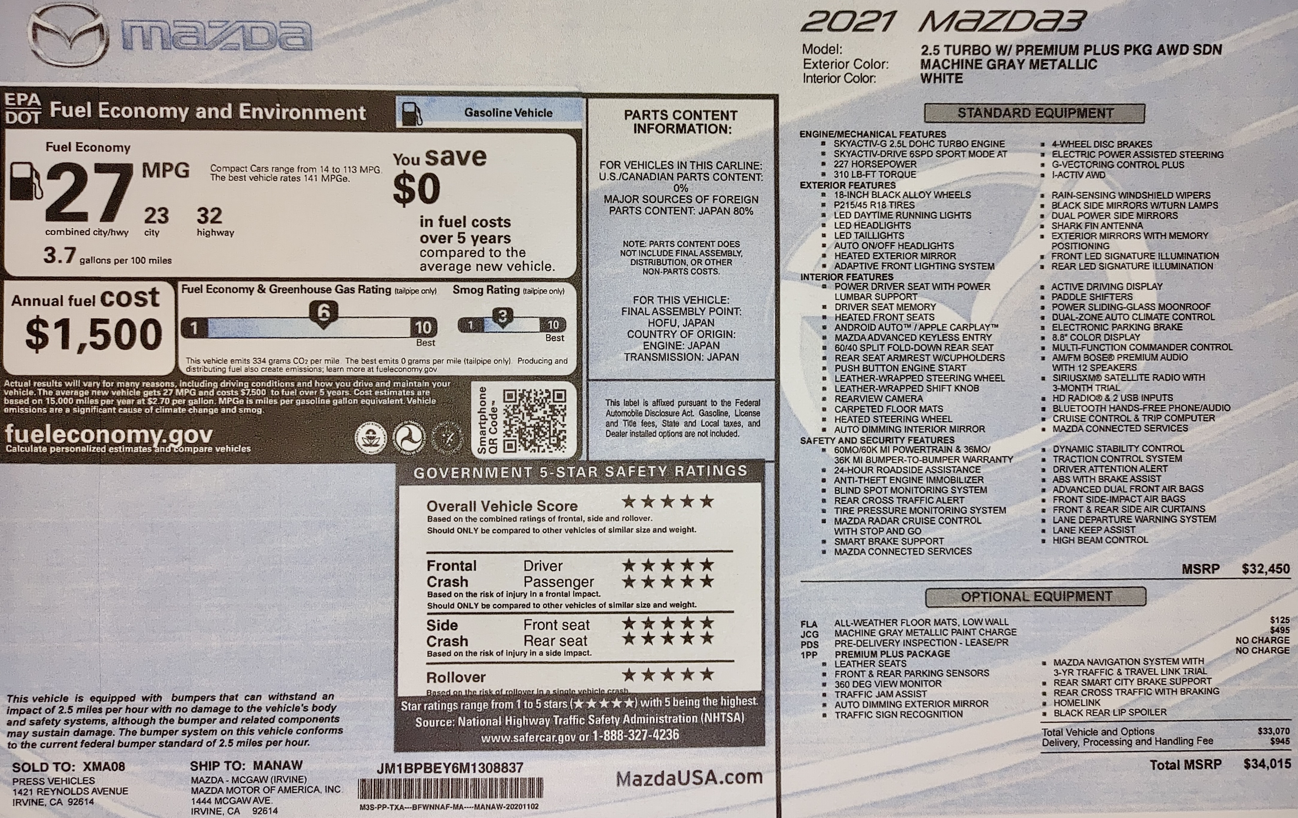 Pure gray paint with dark burgundy and black leather seating for 5 – heated and ventilated front buckets, weighs 4,098 lbs. and is 195.5” long – 40.3 cubic ft. cargo room, 21” – two toned finish ten spoke aluminum wheels and 265/45R21 Pirelli radials, pushbutton/remote start, navigation, dual power