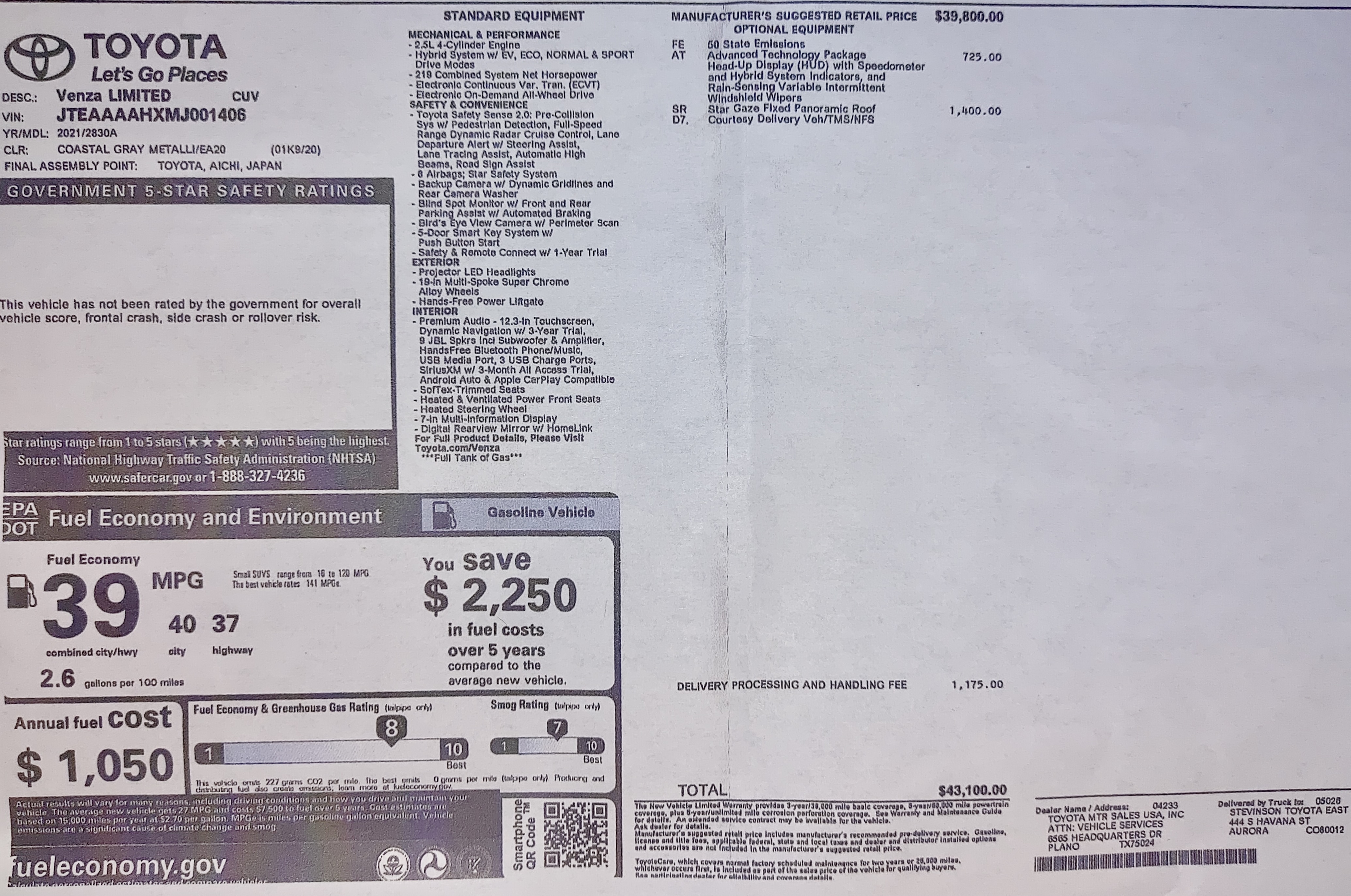 camera, 9 speaker JBL XM/AM/FM premium sound system, radar cruise control, lane change alert, rear cross traffic alert, blind spot warning, 2.5 liter hybrid four with 219 horsepower, CVT automatic transmission and all wheel drive, $43,100.00.00 list price, built in Toyota, Aichi, Japan, fuel economy (37 mpg highway, 40 mpg city, 39 mpg combined), 14.5 gallon tank with 536 mi.range
