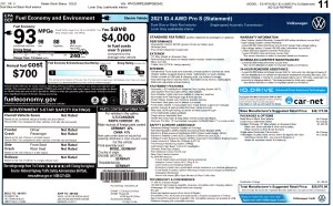 lane keep assist, forward and rear collision alert, radar cruise control, digital dash including one mounted to steering column, rear vision camera, 12” infotainment screen, 10 speaker AM/FM/satellite premium stereo sound system, Apple CarPlay, Android Auto and blind spot monitor, 107 horsepower front electric motor and 201 horsepower rear electric motor (295 hp total) with single speed automatic transmission with dash mounted shifter, (total torque is 339) 4 driving modes and all wheel drive, $50,870.00 list price built in Mosel, Germany, fuel economy 88 mpg on highway, 98 in city, 93 overall – goes 240 mi. on a full charge