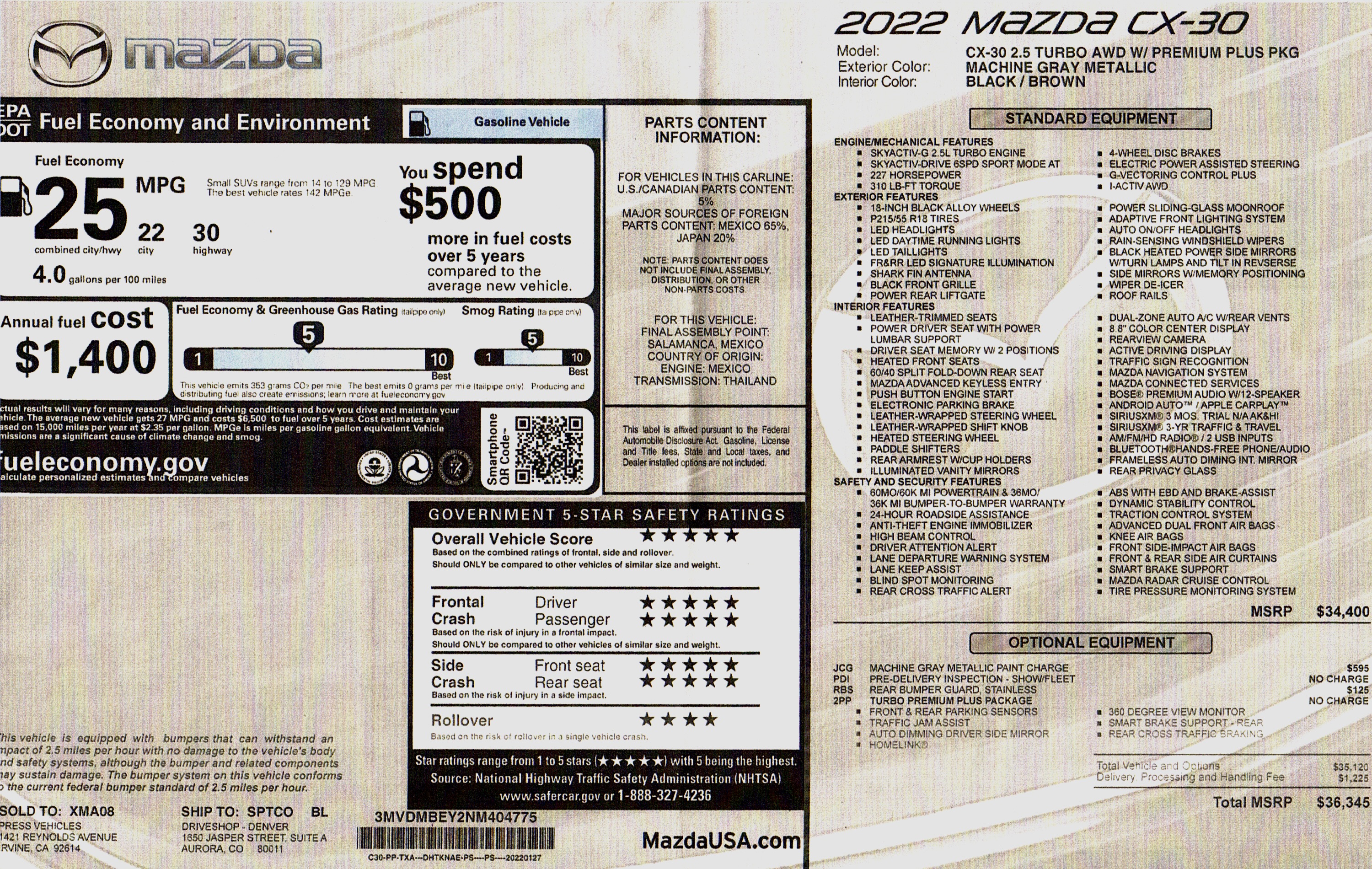 Machine gray metallic paint with black and brown leather seating for 5 – heated and cooled front buckets with console mounted shifter, weighs 3,388 lbs. and has a