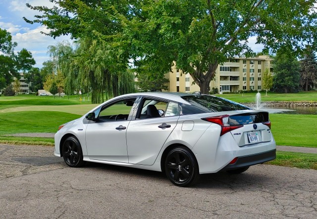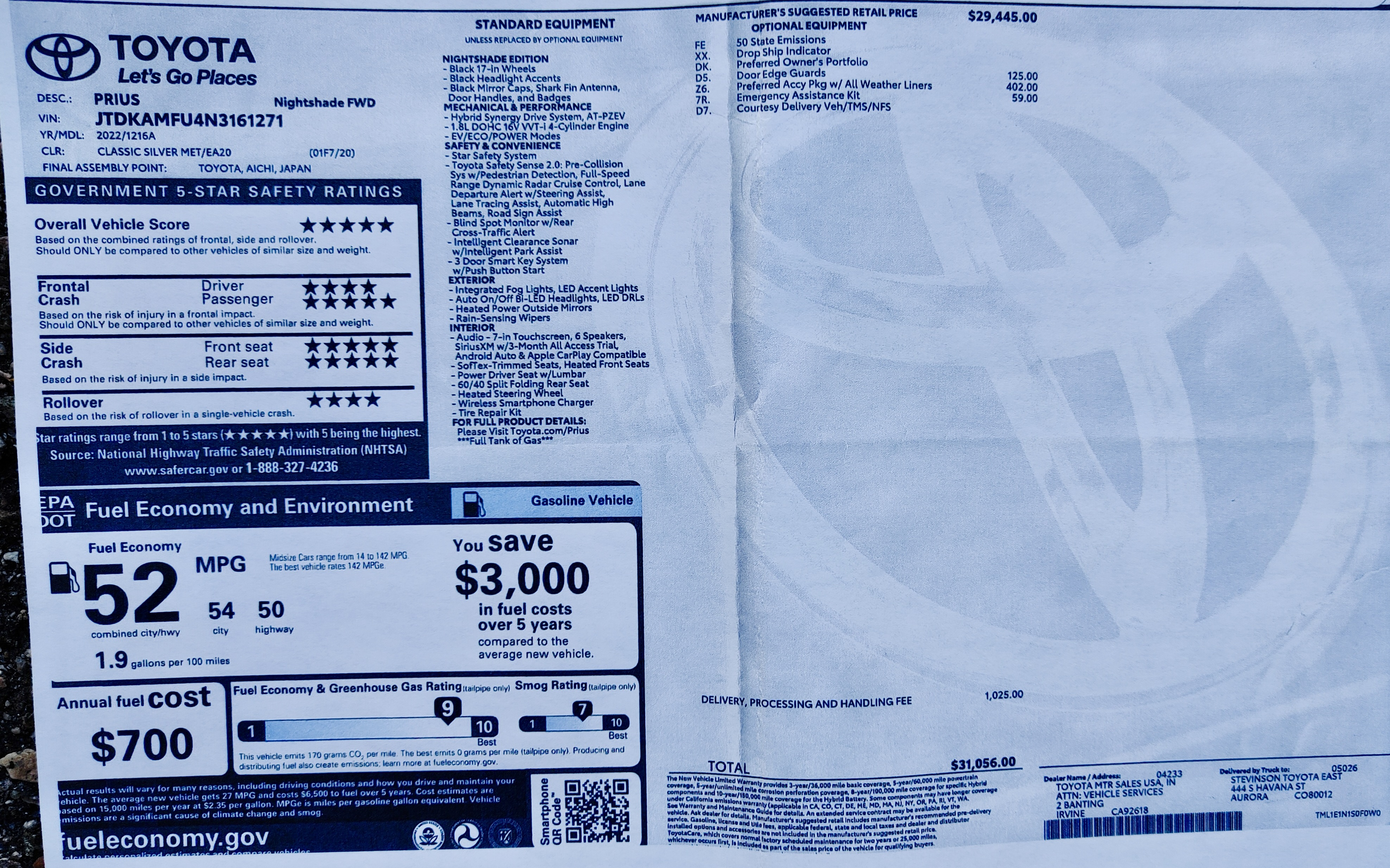 warning, 1.8 liter hybrid four cylinder engine with 121 horsepower, CVT automatic transmission, front wheel drive, $31,056.00 list price – built in Toyota, Aichi, Japan, fuel economy (52 city/highway combined, 54 city, 50 highway) 11.3 gallon tank with 565 mi.range