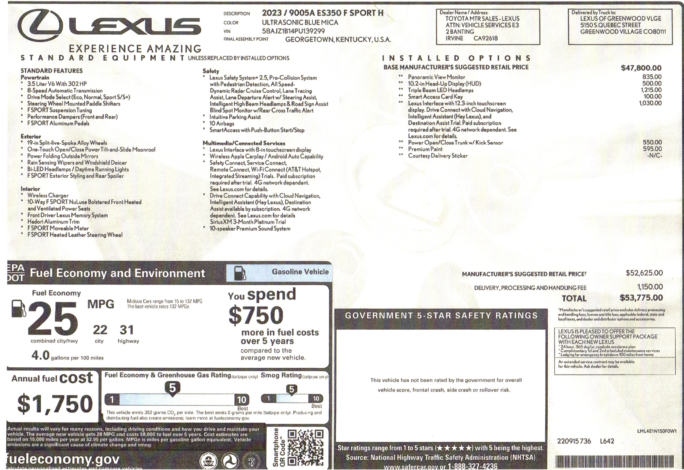 12.3” multimedia infotainment screen, 10.2” head up display in windshield, panoramic multi-view surround camera, wireless flatbed phone charger, heated F Sport steering wheel, dual pane moonroof, pushbutton starter, navigation, power tilt and telescope steering column, 10 speaker Lexus premium FM/AM-Satellite stereo, power trunk lid with kick sensor, Android / Apple integration, radar cruise control, lane change alert/tracing assist, rear cross traffic alert, blind spot warning, 3.5 liter V-6 engine with 302