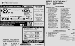 lane keep assist, forward and rear collision alert, radar cruise control, heated leather steering wheel, high definition rear camera, 7″ infotainment screen, rear cross traffic alert, side blind zone alert, 9 speaker Bose AM/FM/satellite premium stereo sound system, Apple CarPlay, and Android Auto, 181 horsepower, 2 liter four with 6 speed standard transmission, (torque is 151) – rear wheel drive, zero to 60 in 5.7 seconds and 140 mph top speed – 34 MPG highway, 26 city and 29 combined rating – 11.9 gallon tank and 405 miles of range, $37,510.00 list price – built in the Hiroshima plant – Japan