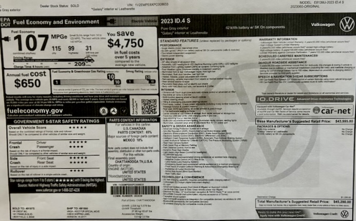 power lift gate with hands-fee feature’ 201 horsepower single electric motor – rear wheel drive, zero to 60 in 7.6 seconds and 112 mph top speed, $45,290.00 list price – built in Chattanooga, TN, 107 MPGe combined rating – 209 miles of range