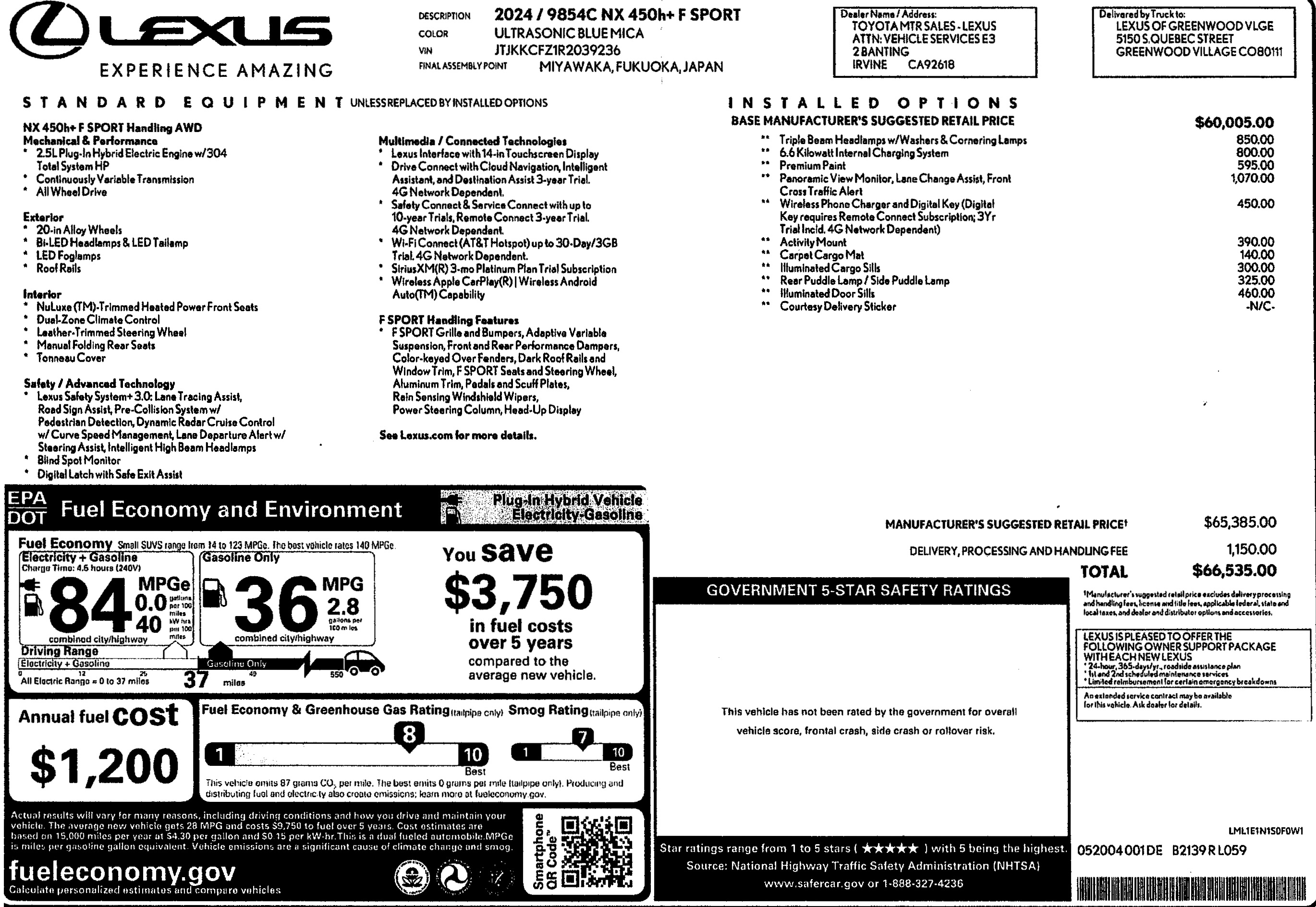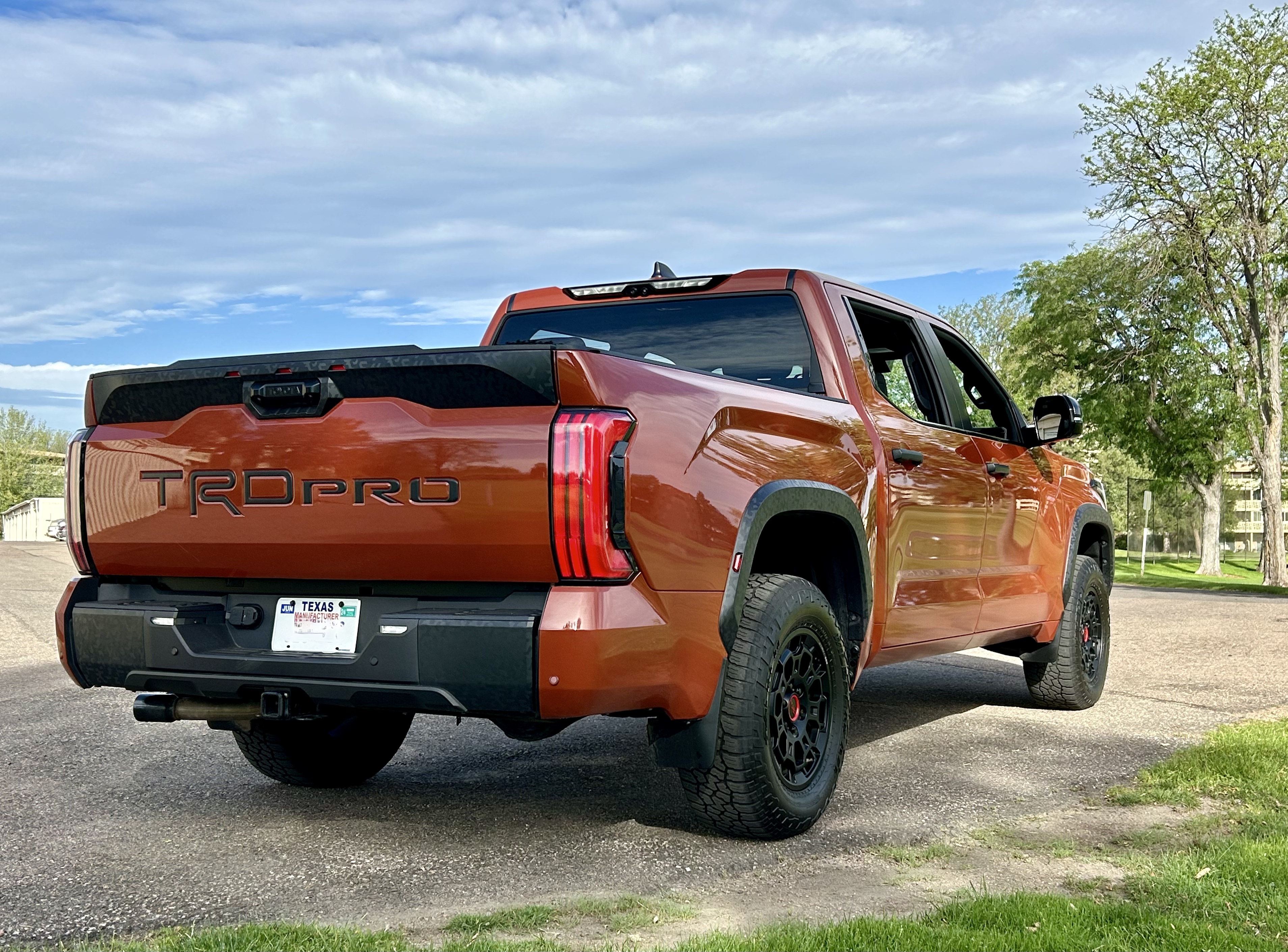 Terra burnt orange paint with black leather trimmed seats – 5 passenger – heated and air-conditioned SofTex seating, weighs 6,015 lbs. has 145.7” wheelbase, and is 233.6“ long, 18” matte black BBS alloy wheels with 33” tall Falken tires, deluxe TRD black trim, console mounted transmission shifter, flatbed phone charger, 14” multimedia display with Sirius satellite radio, 12 speaker JBL studio stereo, and