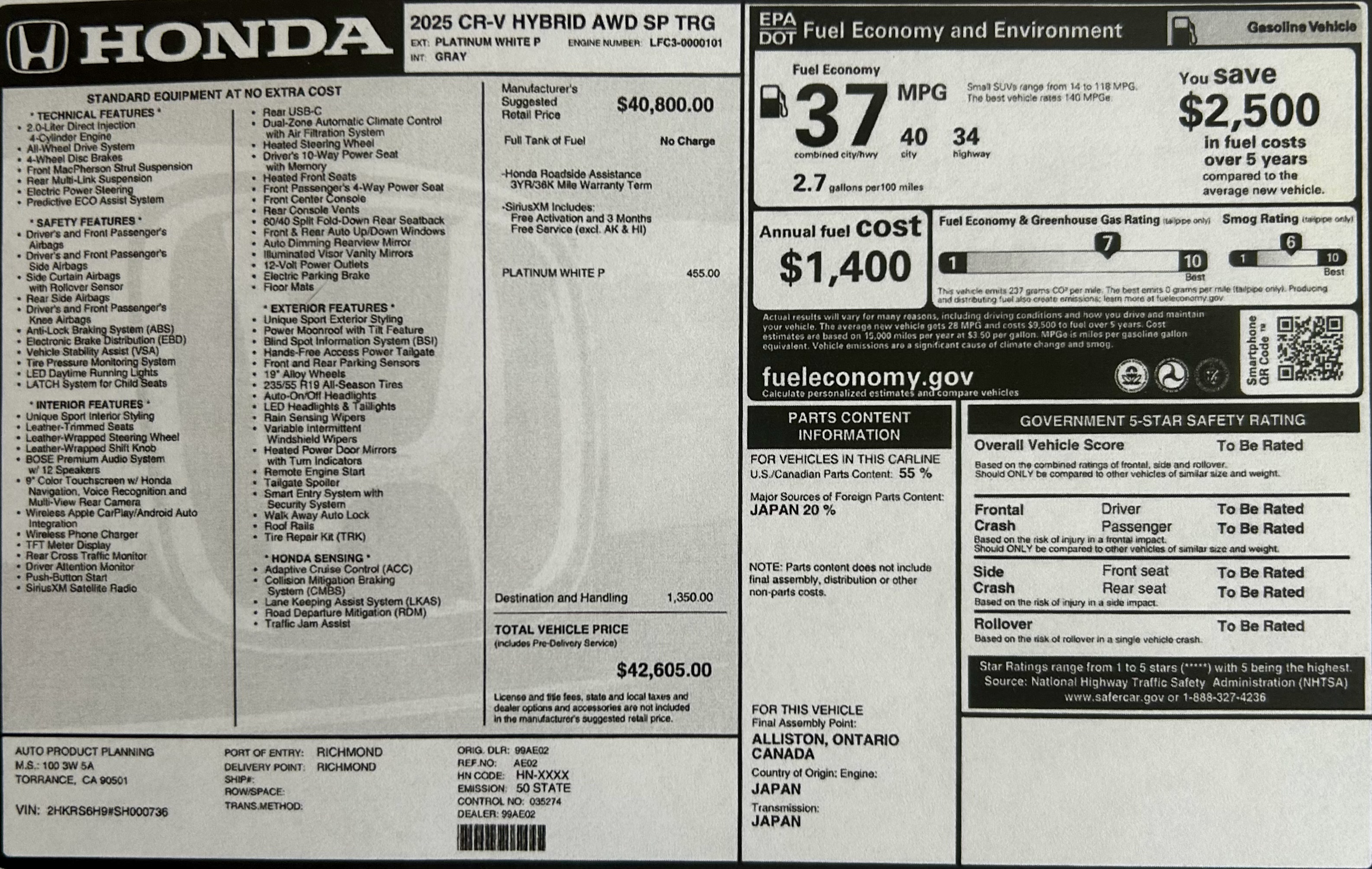 CrossContact all season radials, 9” infotainment screen, rear vision camera setup, radar cruise control, flatbed phone charger, pushbutton/remote electric starter, tilt/telescope steering column, power moonroof, leather wrapped heated steering wheel, navigation, Bose premium FM/AM-Satellite stereo with 12 speakers, heated exterior automatic folding mirrors, and Apple CarPlay/Android Auto capability, 204 horsepower 2 liter four cylinder hybrid engine, 247 lb. ft. of torque, CVT automatic with all wheel drive, zero to 60 in 7.9 seconds and 106 mph top speed, $42,605.00 list price, built in Alliston, Ontario, Canada, 34 MPG highway rating, 37 mpg combined rating, 40 mpg city rating, 14 gallon gas tank with range of 476