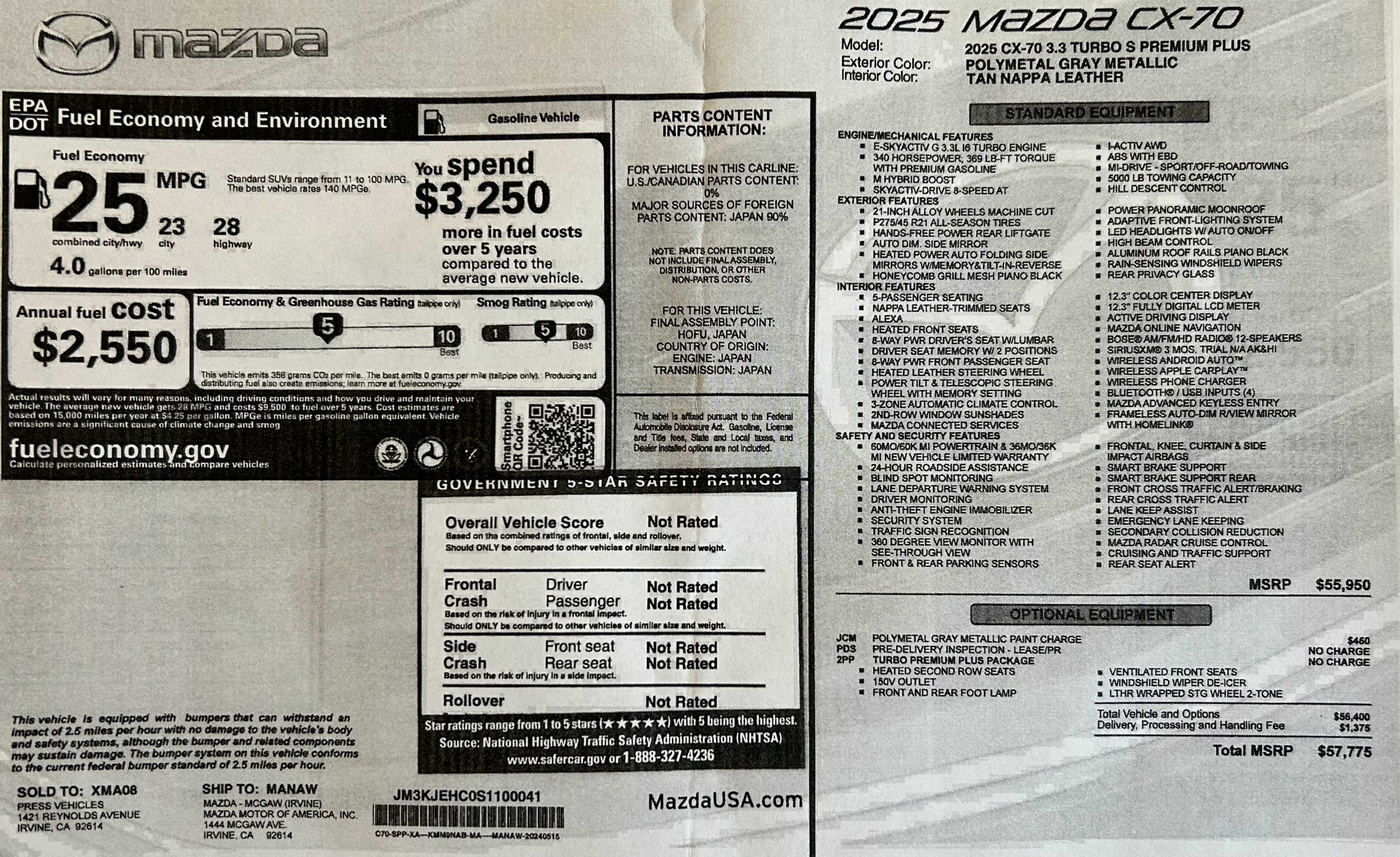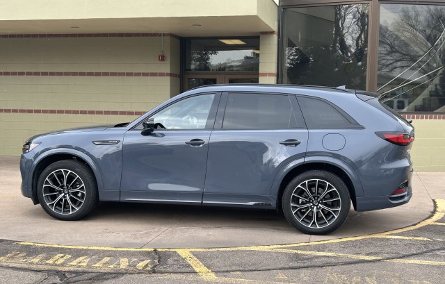 flatbed phone charger, 12.3” multimedia display, Sirius satellite Bose 12 speaker studio stereo, folding outside power and heated mirrors, suede dashboard and leather wrapped/heated steering wheel, radar cruise control, Apple Car Play/Android Auto setup, surround vision camera, navigation, panoramic power tilting and sliding glass moon roof, power tailgate with hands free operation, 3.3 liter turbo inline 6 with 340 horsepower, 8 speed automatic transmission with all wheel drive and paddle shifters – (torque is 369) – zero to 60 in 6.2 seconds – 119 mph top speed, fuel economy is 28 on the highway, 23 in town and 25 mpg overall rating. Fuel tank holds 18.5 gallons and the Mazda can go 518 miles on a full tank, list price is $57,775.00, built in Hofu, Japan