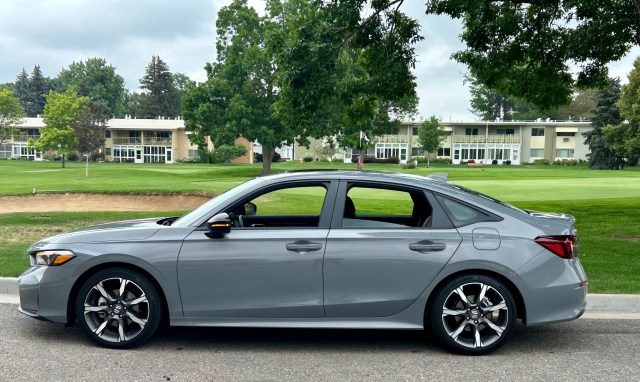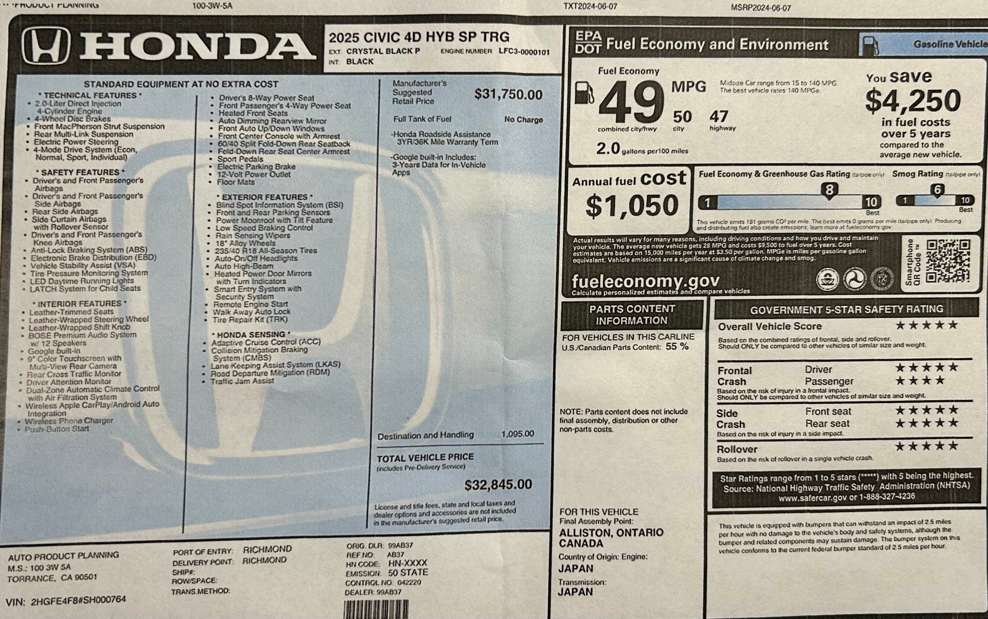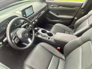 satellite Bose 12 speaker studio stereo, outside power and heated mirrors, leather wrapped heated steering wheel, radar cruise control, Apple Car Play/Android Auto setup, rear vision camera, navigation, 2.0 liter four with 200 horsepower, 232 lb. ft. of torque, CVT automatic transmission with front wheel drive – zero to 60 in 7 seconds – 113 mph top speed, fuel economy is 47 on the highway, 50 in town and 49 mpg overall rating. Fuel tank holds 10.6 gallons and the Civic can go 498 miles on a full tank, list price is $31,475.00.00 – built in Alliston, Ontario, Canada