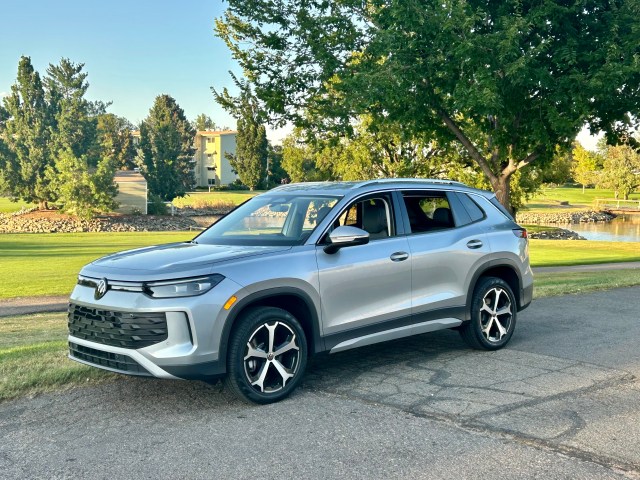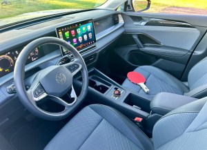 Silver metallic paint with Grigio and black V-Tex seats – 5 passenger – heated/a.c. buckets in the front, four door crossover that weighs 3,801 lbs., has 109.9” wheelbase, is 184.9“ long, and cargo area holds 27 cubic ft., 19” polished two-toned alloy wheels with 235/45R19 Pirelli’s, V-Tex interior trim, steering column mounted transmission shifter, flatbed phone charger, 12.9” multimedia display, Sirius satellite 7 speaker studio stereo, outside power and heated mirrors, leather wrapped heated steering wheel, radar cruise control, Apple Car Play/Android Auto setup, rear vision and surround vision camera and navigation, 2.0 liter turbo four with 201 horsepower, 221 lb. ft. of torque, eight speed automatic transmission with all wheel drive – zero to 60 in 7.7 seconds – 113 mph top speed, fuel economy is 30 on the highway, 22 in town and 25 mpg overall rating.  Fuel tank holds 15.3 gallons and the Tiguan can go 459 miles on a full tank, list price is $35,220.00 – built in United States and Mexico