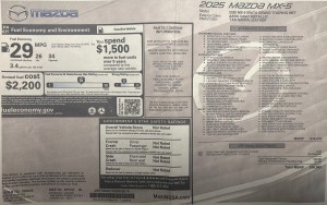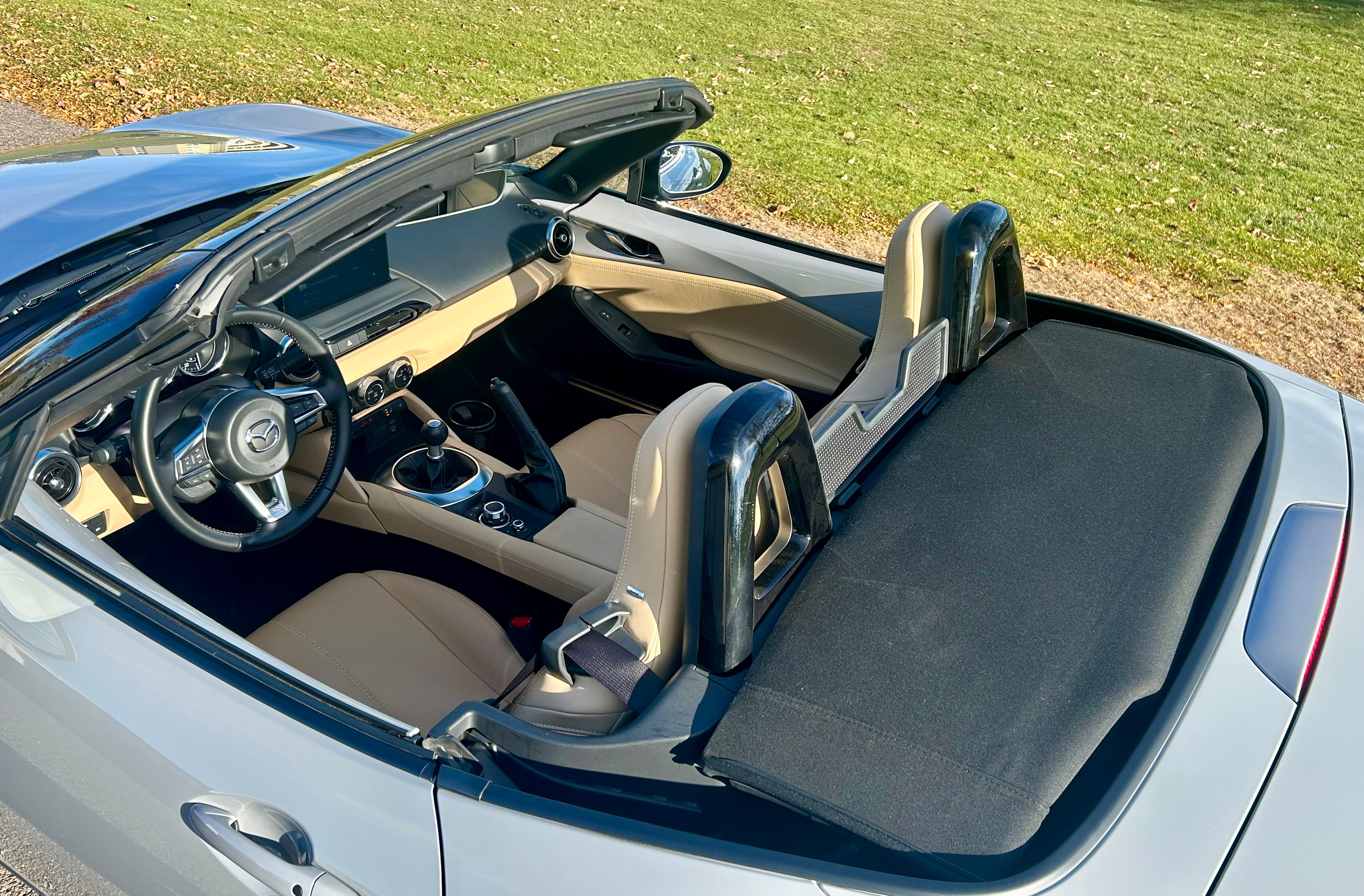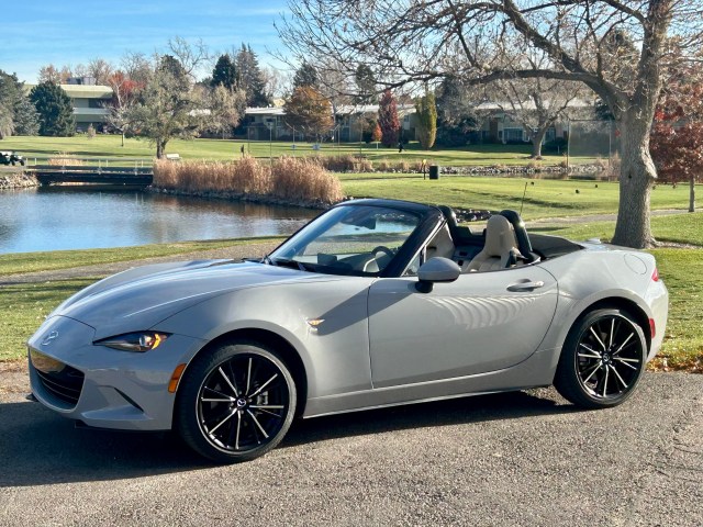Aero gray metallic paint with tan leather seating for 2 – heated front buckets, weighs 2,454 lbs., 154.1” long, 90.9” wheelbase and trunk capacity is 4.6 cubic ft., 17” x 8” matte black and polished finish aluminum multi spoke wheels and 205/45R17 Bridgestone Potenza all season radials, Grand Touring trim, 8.8” infotainment screen, rear vision camera, radar cruise control, flatbed phone charger, pushbutton/remote electric starter, tilt/telescope steering column, leather wrapped steering wheel, cloth convertible top, navigation, Bose FM/AM-Satellite stereo with 9 speakers and Apple CarPlay/Android Auto capability, 181 horsepower 2.0 liter four cylinder turbo engine, 151 lb. ft. of torque, six speed manual with rear wheel drive, zero to 60 in 5.7 seconds and 106 mph top speed, $36,565.00 list price, built in Hiroshima, 34 MPG highway rating, 29 mpg combined rating, 26 mpg city rating, 11.9 gallon gas tank with range of 405