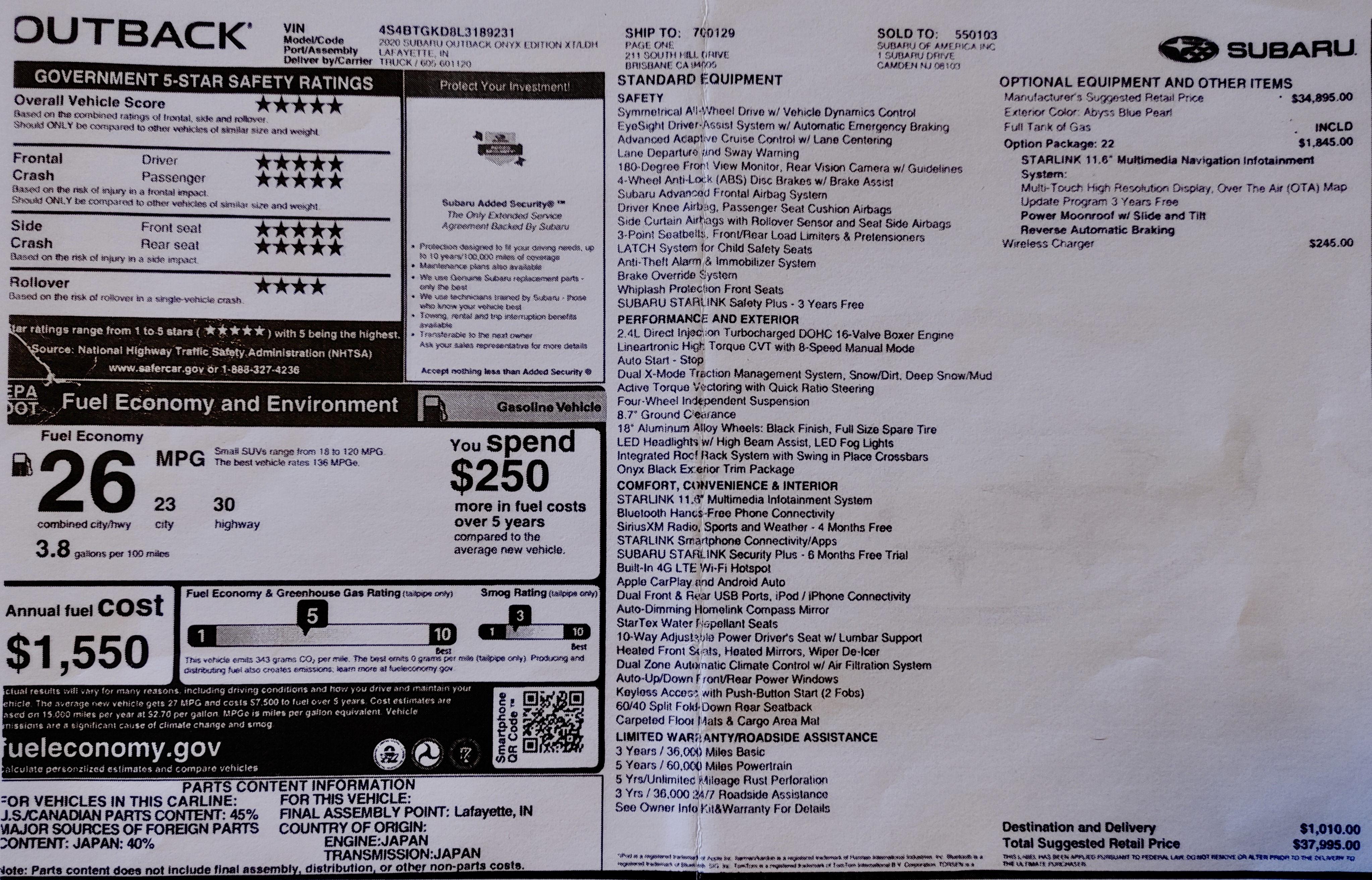 This last week I received a Subaru to test, a 2020 Outback with the four-cylinder turbocharged engine and continuously variable transmission (CVT). It was the Onyx edition in Abyss Blue Pearl with two-toned gray StarTex interior. This car is made by Fuji Heavy Industries, a Japanese firm, with final assembly taking place in Lafayette, Indiana. The Onyx is one of the the top-line Outbacks out of seven models offered in both turbo and non-turbo configurations. This one had an option package that included Starlink 11.6” multimedia navigation infotainment system, moon roof, and reverse automatic braking. This $1,845.00 package, plus $245.00 for wireless charger, brought the total M.S.R.P. to $37,995.00, including freight. I really enjoyed the charger in the console for keeping my flip phone charged up.