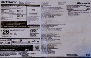 This last week I received a Subaru to test, a 2014 Outback with the four-cylinder engine and continuously variable transmission (CVT). It was the 2.5i “Limited” model in Satin White Pearl with Warm Ivory white leather interior. This car is made by Fuji Heavy Industries, a Japanese firm, with final assembly taking place in Lafayette, Indiana. It is sold by Greeley Subaru, a division of Weld County Garage. The Limited is the top-line Outback, out of four models offered in both four-, and six-cylinder configurations. This one had an option package that included power moon roof, 440-watt, 9-speaker harman/kardon stereo with XM satellite radio, Bluetooth phone, backup camera (4.3” display), and Ipod/USB connections. This $2,041.00 package, plus $244.00 for “puddle lights”, and $438.00 for remote starter, brought the total M.S.R.P. to $32,770.00, including freight. I really enjoyed the puddle lights that shine beneath each of the four doors on the vehicle, after dark.